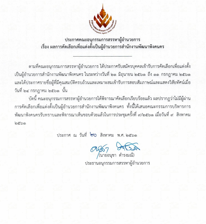 ประกาศ เรื่อง ผลการคัดเลือกเพื่อแต่งตั้งเป็นผู้อำนวยการสำนักงานพัฒนาพิงคนคร