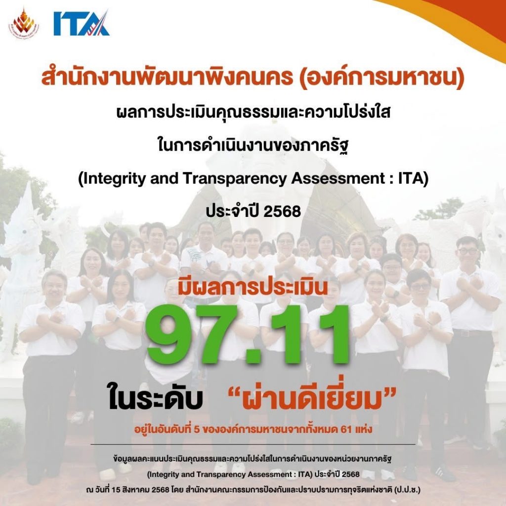 (ภาษาไทย) สำนักงานพัฒนาพิงคนคร (องค์การมหาชน) ได้รับผลคะแนนการประเมินคุณธรรมและความโปร่งใสในการดำเนินงานของภาครัฐ (Integrity and Transparency Assessment : ITA) ประจำปีงบประมาณ พ.ศ.2568