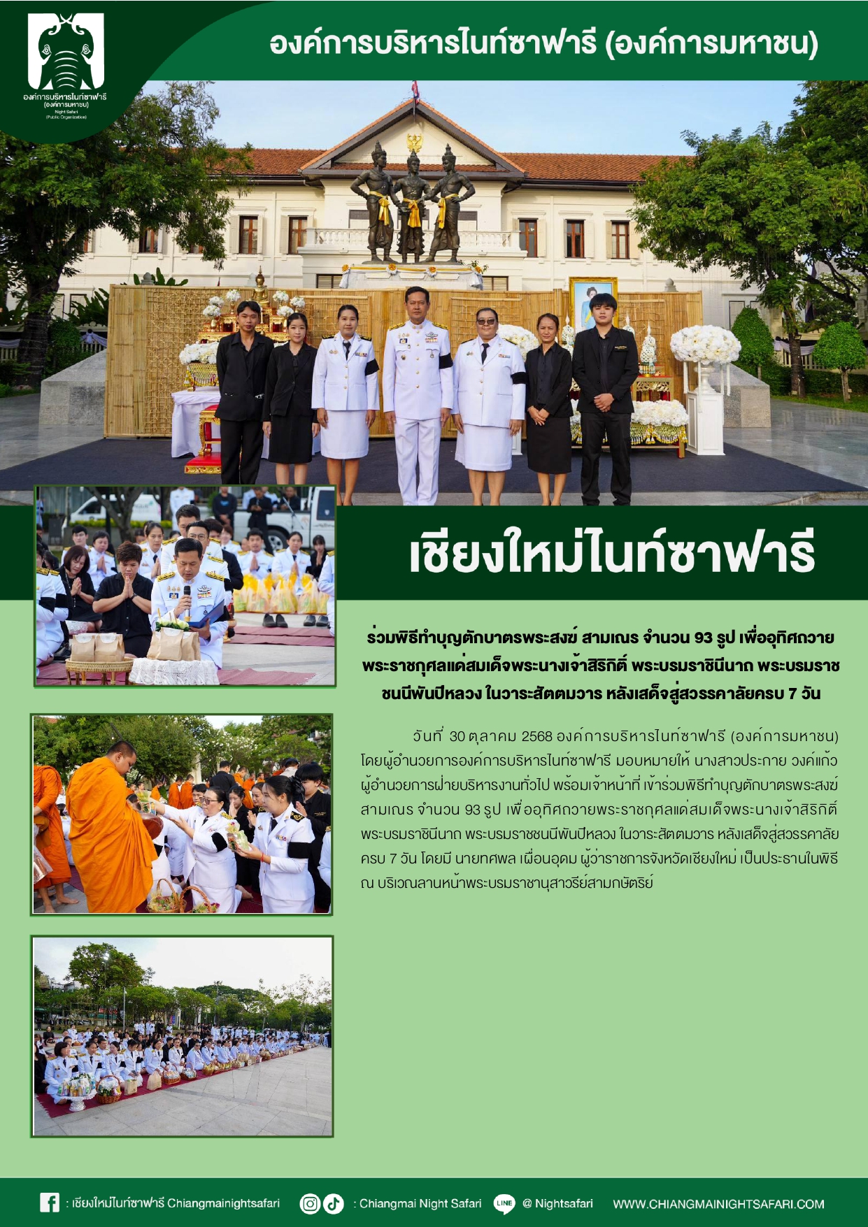 เชียงใหม่ไนท์ซาฟารี ร่วมพิธีทำบุญตักบาตรพระสงฆ์ สามเณร จำนวน 93 รูปเพื่ออุทิศถวายพระราชกุศลแด่สมเด็จพระนางเจ้าสิริกิติ์ พระบรมราชินีนาถ พระบรมราชชนนีพันปีหลวง ในวาระสัตตมวาร หลังเสด็จสู่สวรรคาลัยครบ 7 วัน