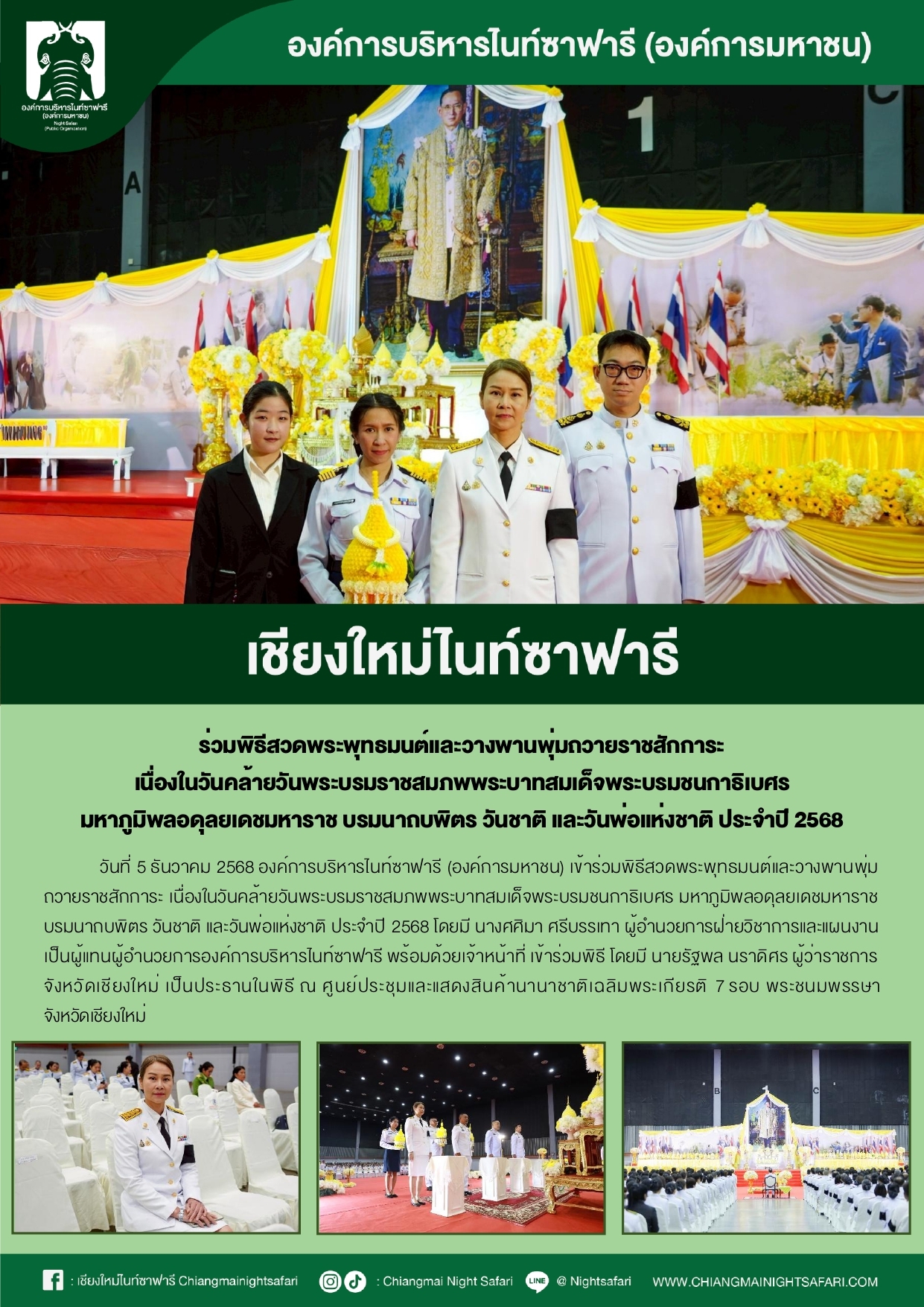 เชียงใหม่ไนท์ซาฟารี ร่วมพิธีสวดพระพุทธมนต์และวางพานพุ่มถวายราชสักการะเนื่องในวันคล้ายวันพระบรมราชสมภพพระบาทสมเด็จพระบรมชนกาธิเบศร มหาภูใิพลอดุลยเดชมหาราช บรมนาถบพิตร วันชาติ และวันพ่อแห่งชาติ ประจำปี 2568