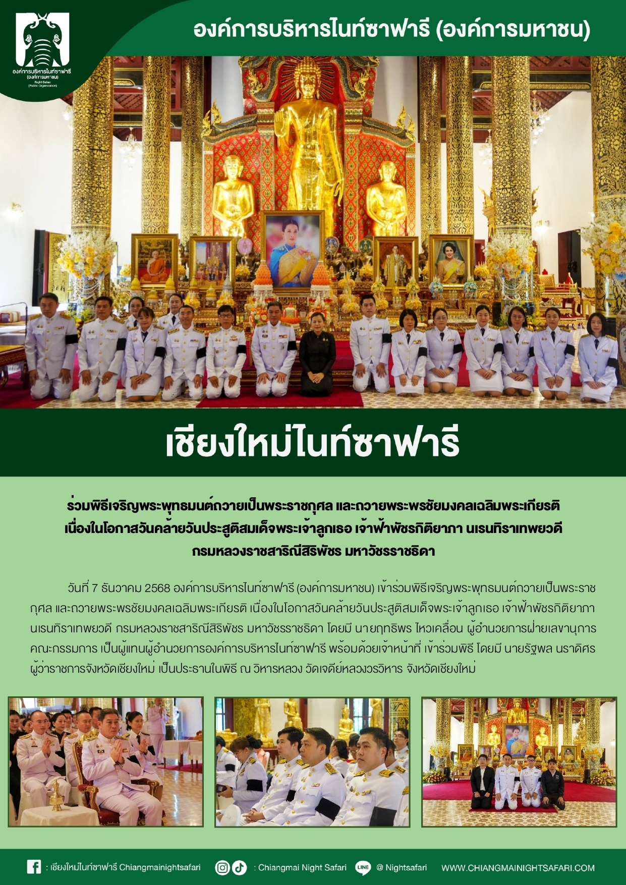 เชียงใหม่ไนท์ซาฟารี ร่วมพิธีเจริญพระพุทธมนต์ถวายเป็นพระราชกุศล และถวายพระพรชัยมงคลเฉลิมพระเกียรติเนื่องในโอกาศวันคล้ายวันประสูติสมเด็จพระเจ้าลูกเธอ เจ้าฟ้าพัชรกิติยาภา นเรนทิราเทพยวดีกรมหลวงราชสาธิณีสิริพัชร มหาวัชรราชธิดา
