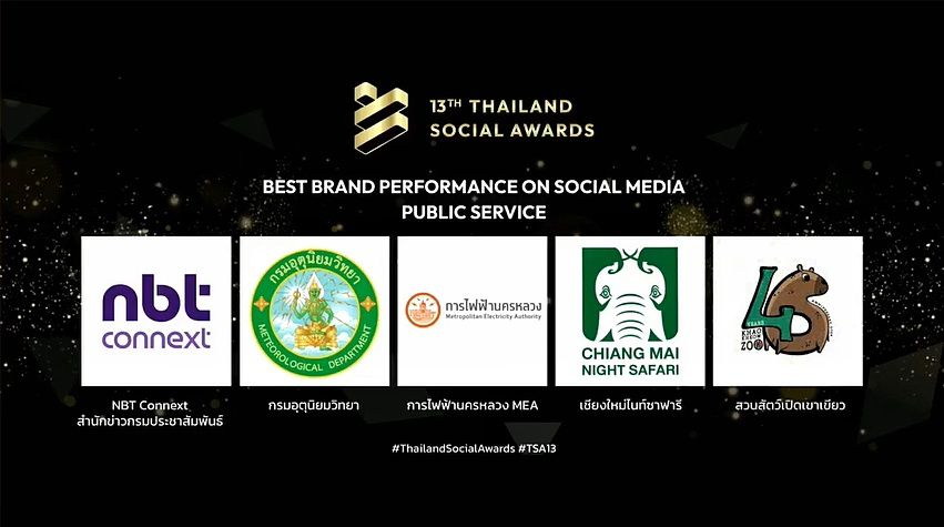 งาน THAILAND SOCIAL AWARDS ครั้งที่ 13 เป็นงานประกาศรางวัลโซเชียลที่ยิ่งใหญ่ที่สุดของประเทศไทย และจัดขึ้นเพื่อให้ความสำคัญกับวงการโซเชียลที่เป็นส่วนหนึ่งในการขับเคลื่อนธุรกิจและเศรษฐกิจภาพรวมของประเทศไทย ผ่านการมอบรางวัลเพื่อส่งเสริม เชิดชูแบรนด์ที่ใช้โซเชียลมีเดียอย่างสร้างสรรค์ และยกระดับวงการโซเชียลในสาขาต่างๆ และในปีนี้ เชียงใหม่ไนท์ซาฟารีได้ติดอันดับ 1 ใน 5 แบรนด์ ในกลุ่มหน่วยงานบริการ ที่ทำผลงานยอดเยี่ยมบนโซเชียลมีเดีย เข้าร่วมชิงรางวัล Best Brand Performance on Social Media ในสาขา Public Service
