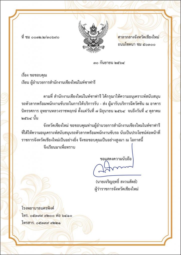 ในวันที่ 4 ตุลคม 2564 สำนักงานพัฒนาพิงคนคร (องคืการมหาชน) โดยสำนักงานเชียงใหมไนท์ซาฟารี เข้ารับหนังสือขอบคุณจากจังหวัดเชียงใหม่ เนื่องจากสำนักงานเชียงใหม่ไนท์ซาฟารี ได้สนับสนุนรถลากพร้อมพนักงานขับรถ ในการรับ-ส่ง ผู้มารับบริการฉัดวัชซีน ณ อาคารนิทรรศการอุทยานหลวงราชพฤกษ์ ตั้งแต่วันที่ 7 มิถุนายน – 4 ตุลาคม 2564 โดยมีนางสาวรัตนา เรือนทราย ผุ้อำนวยการฝ่ายบริการ เป็นผู้รับมอบ