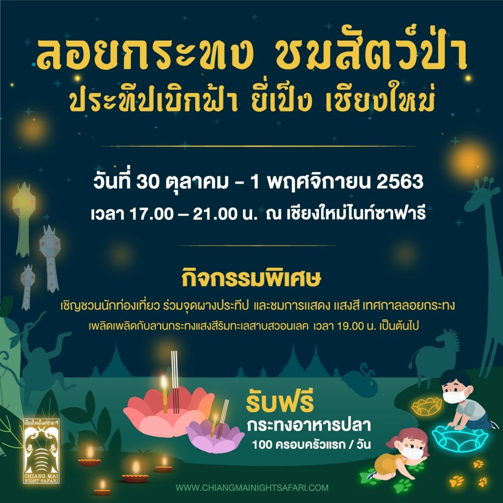 เปลี่ยนบรรยากาศมาทีเชียงใหม่ไนท์ซาฟารี ดื่มด่ำชมสัตว์ป่าในบรรยากาศ กลิ่นอายของเทศกาลยี่เป็ง พร้อมร่วมจุดผางประทีป และชมการแสดงชุดพิเศษ แสง สีเทศกาลลอยกระทงยามค่ำคืน