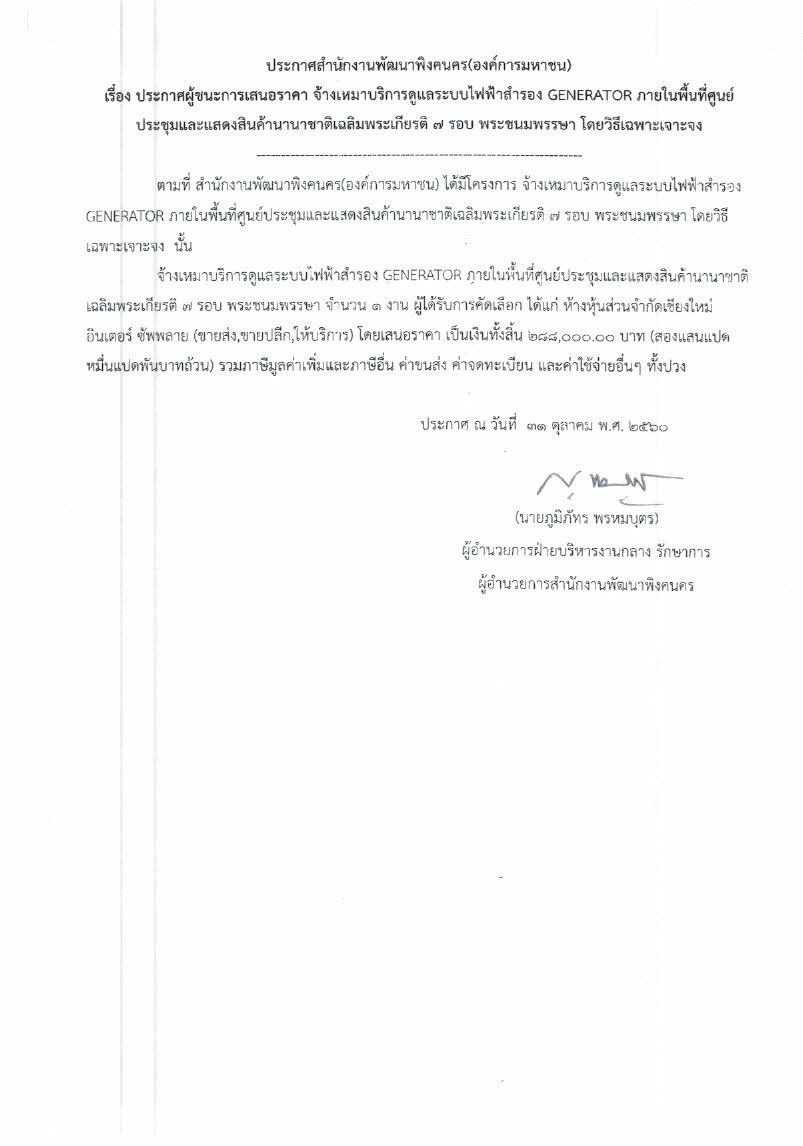 (ภาษาไทย) ประกาศผู้ชนะการเสนอราคา จ้างเหมาบริการดูแลระบบไฟฟ้าสำรอง GENERATOR ภายในศูนย์ประชุมและแสดงสินค้านานาชาติเฉลิมพระเกียรติ 7 รอบ พระชนมพรรษา โดยวิธีเฉพาะเจาะจง