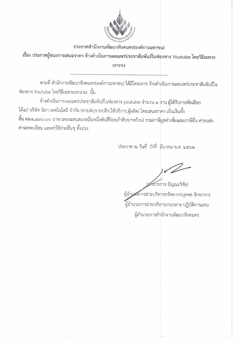 (ภาษาไทย) ประกาศผู้ชนะการเสนอราคา จ้างดำเนินการเผยแพร่ประชาสัมพันธ์ในช่องทาง Youtube โดยวิธีเฉพาะเจาะจง