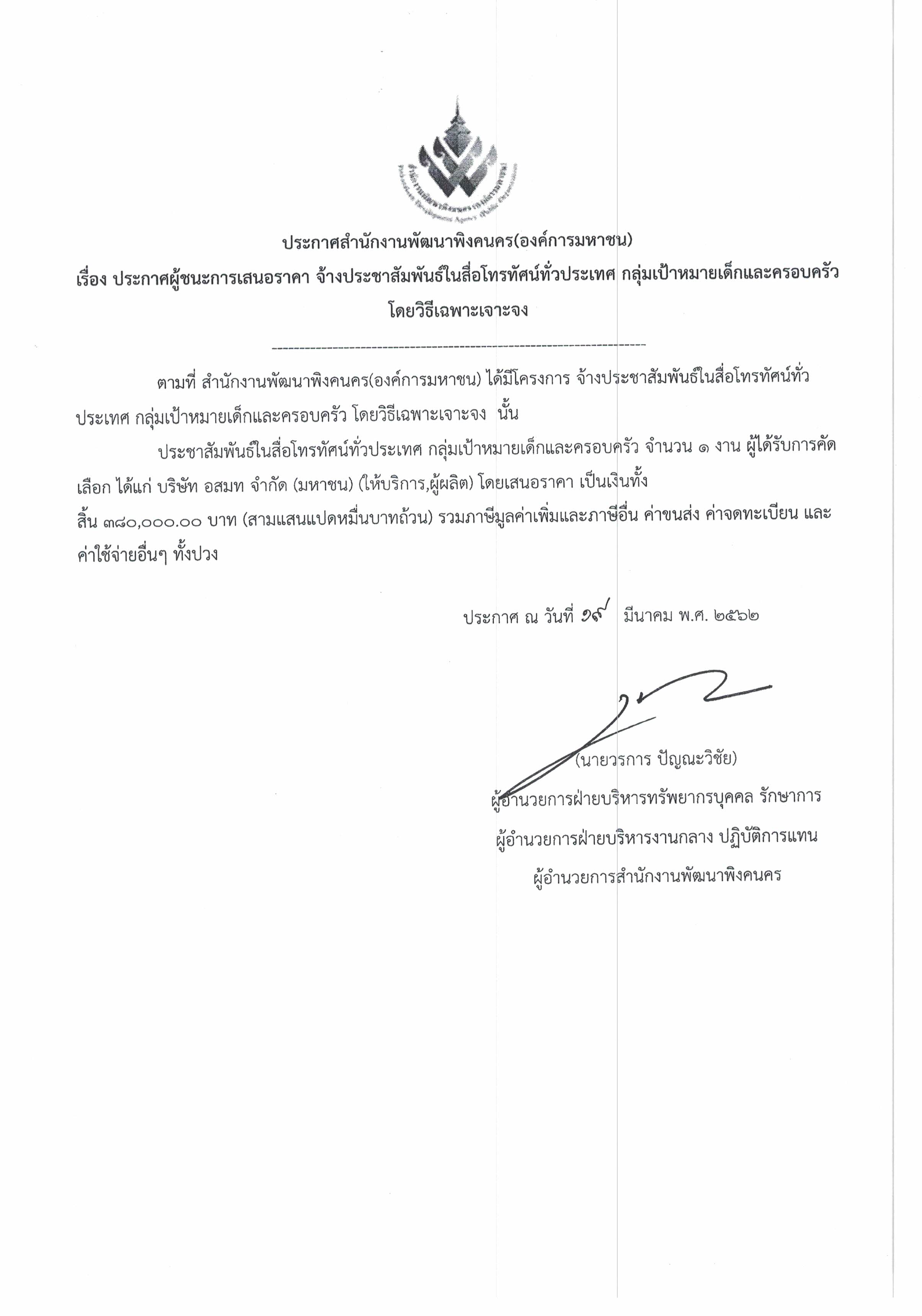 (ภาษาไทย) ประกาศผู้ชนะการเสนอราคา จ้างประชาสัมพันธ์ในสื่อโทรทัศน์ทั่วประเทศ กลุ่มเป้าหมายเด็กและครอบครัว โดยวิธีเฉพาะเจาะจง