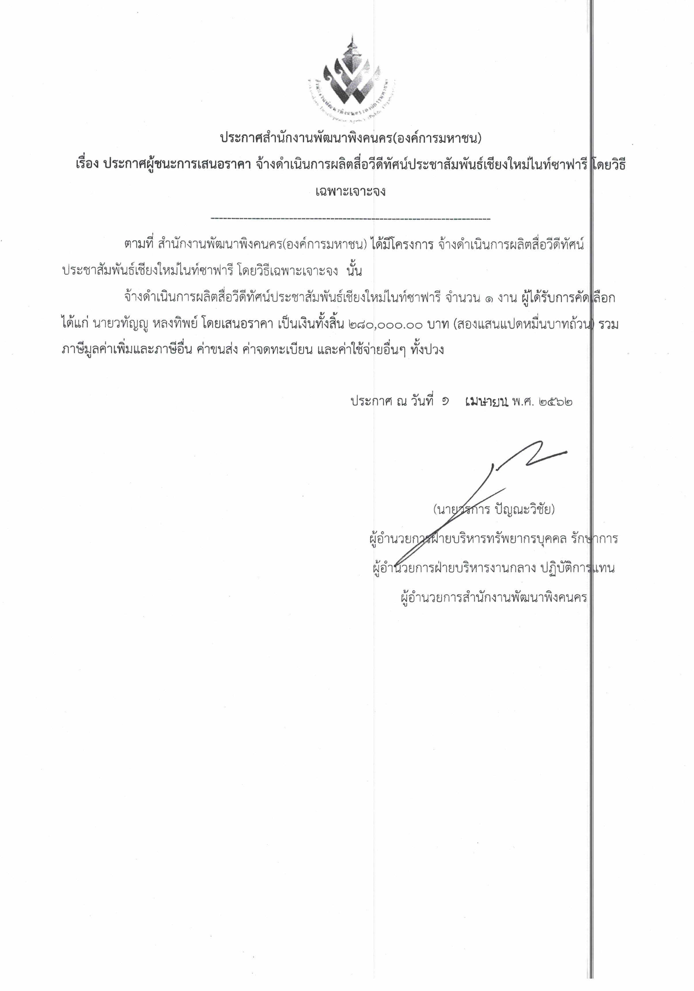 (ภาษาไทย) ประกาศผู้ชนะการเสนอราคา จ้างดำเนินการผลิตสื่อวีดิทัศน์ประชาสัมพันธ์เชียงใหม่ไนท์ซาฟารี โดยวิธีเฉพาะเจาะจง