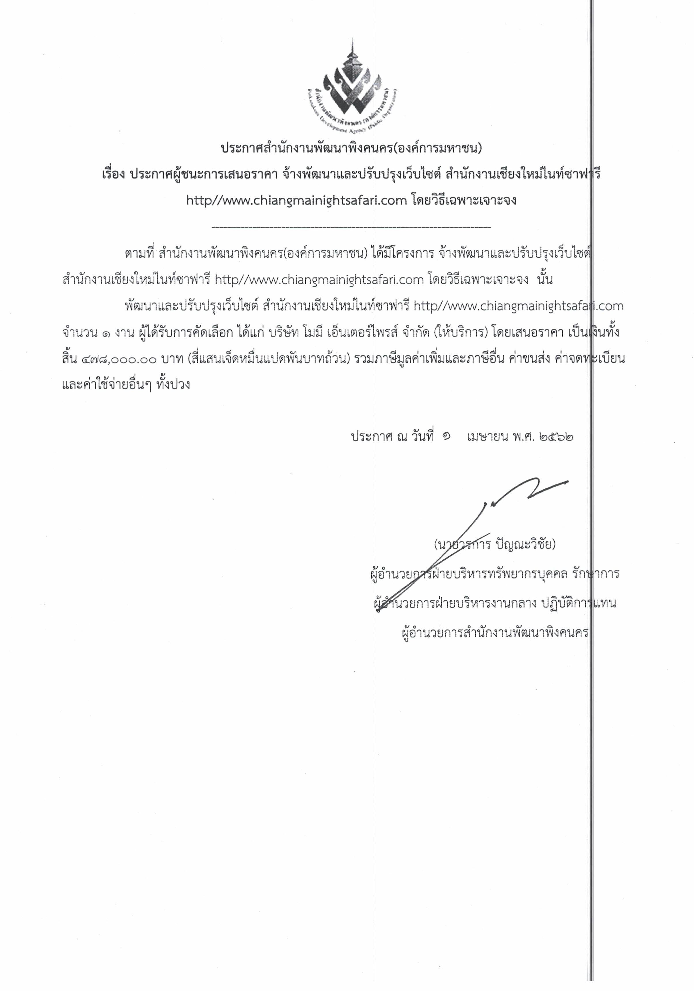 (ภาษาไทย) ประกาศผู้ชนะการเสนอราคา จ้างพัฒนาและปรับปรุงเว็บไซต์ สำนักงานเชียงใหม่ไนท์ซาฟารี http://www.chiangmainightsafari.com โดยวิธีเฉพาะเจาะจง