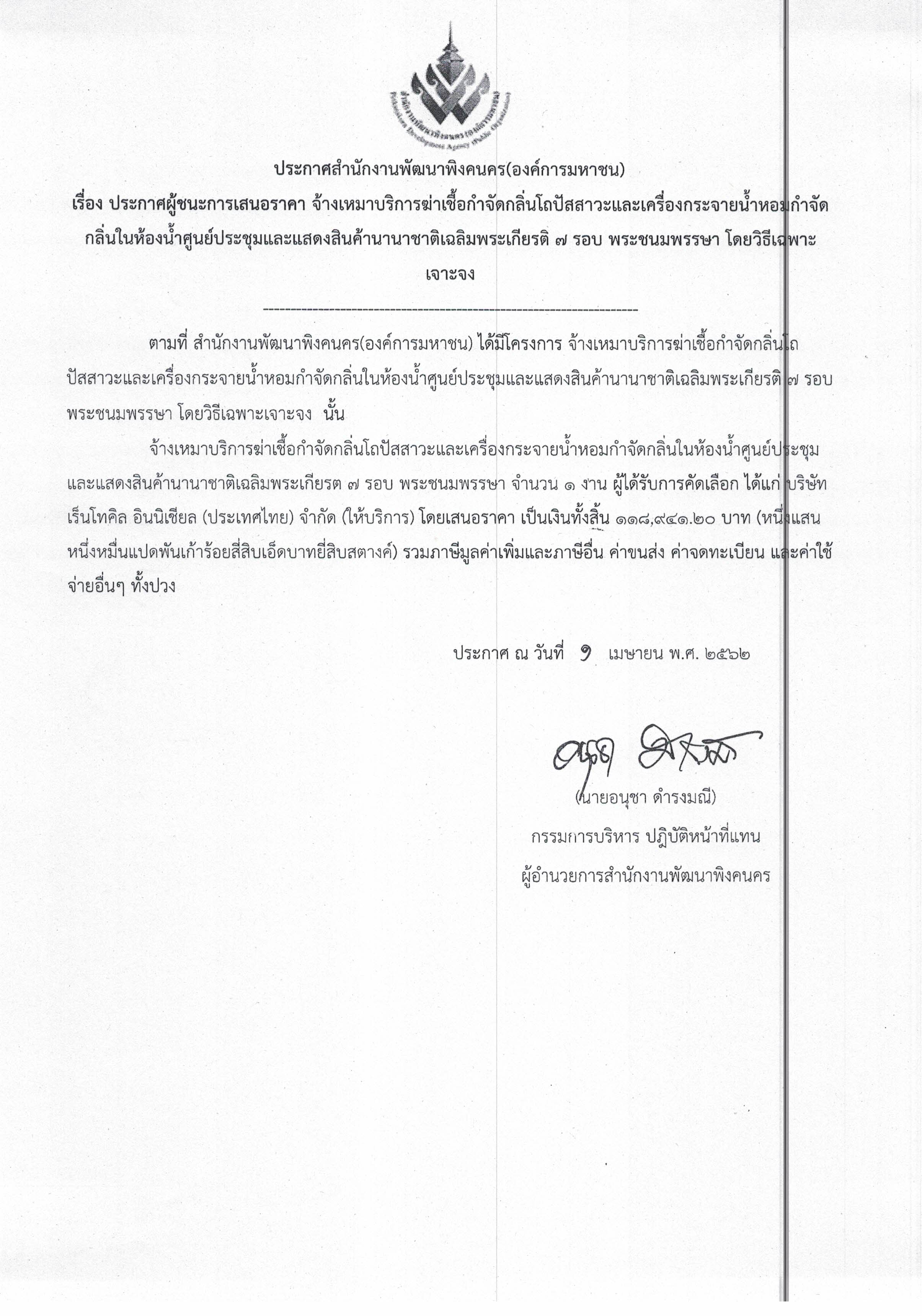 (ภาษาไทย) ประกาศผู้ชนะการเสนอราคา จ้างเหมาบริการฆ่าเชื้อกำจัดกลิ่นโถปัสสาวะและเครื่องกระจายน้ำหอมกำจัดกลิ่นในห้องน้ำศูนย์ประชุมและแสดงสินค้านานาชาติเฉลิมพระเกียรติ 7 รอบพระชนมพรรษา โดยวิธีเฉพาะเจาะจง