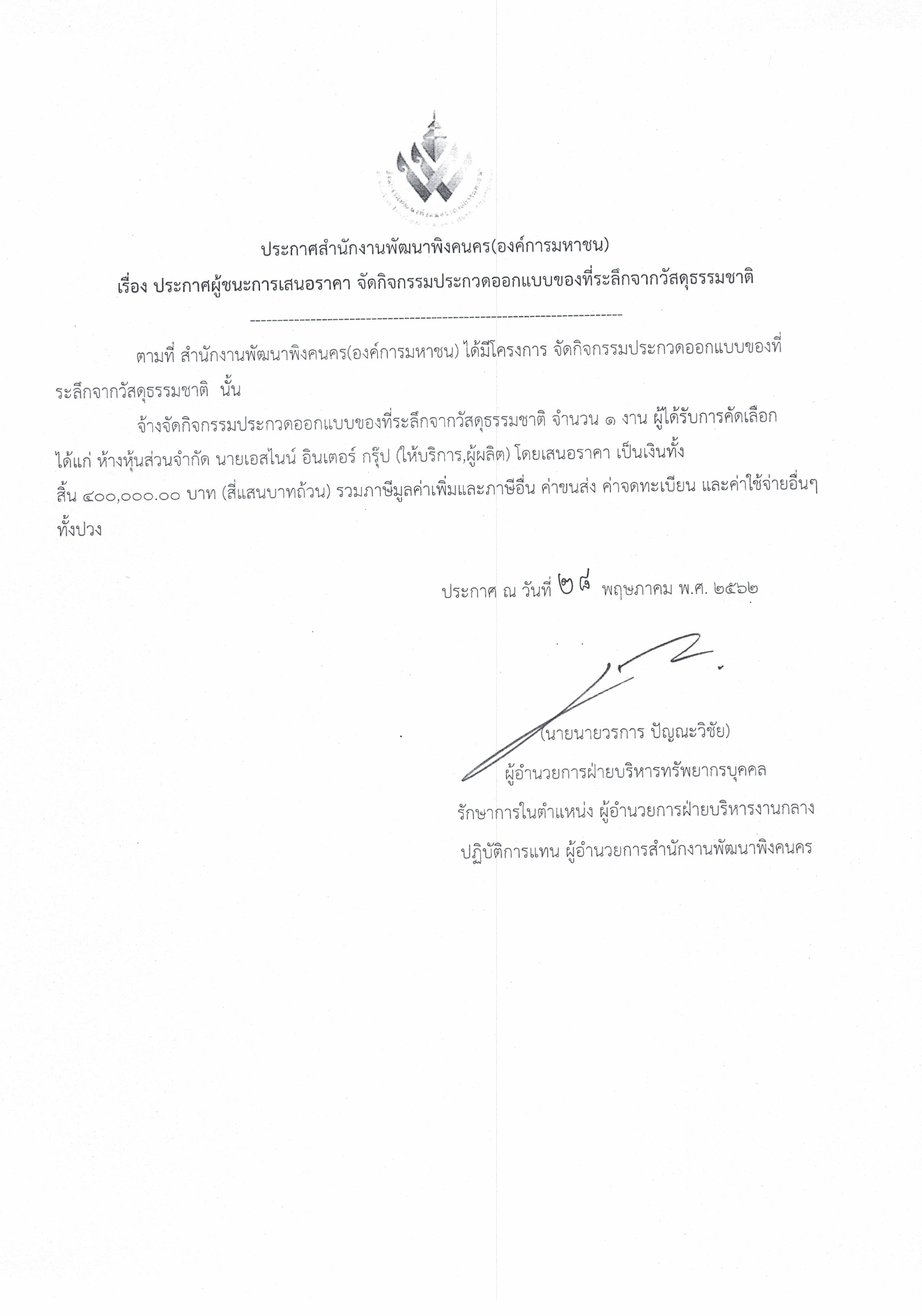 (ภาษาไทย) ประกาศผู้ชนะการเสนอราคา จัดกิจกรรมประกวดออกแบบของที่ระลึกจากวัสดุธรรมชาติ