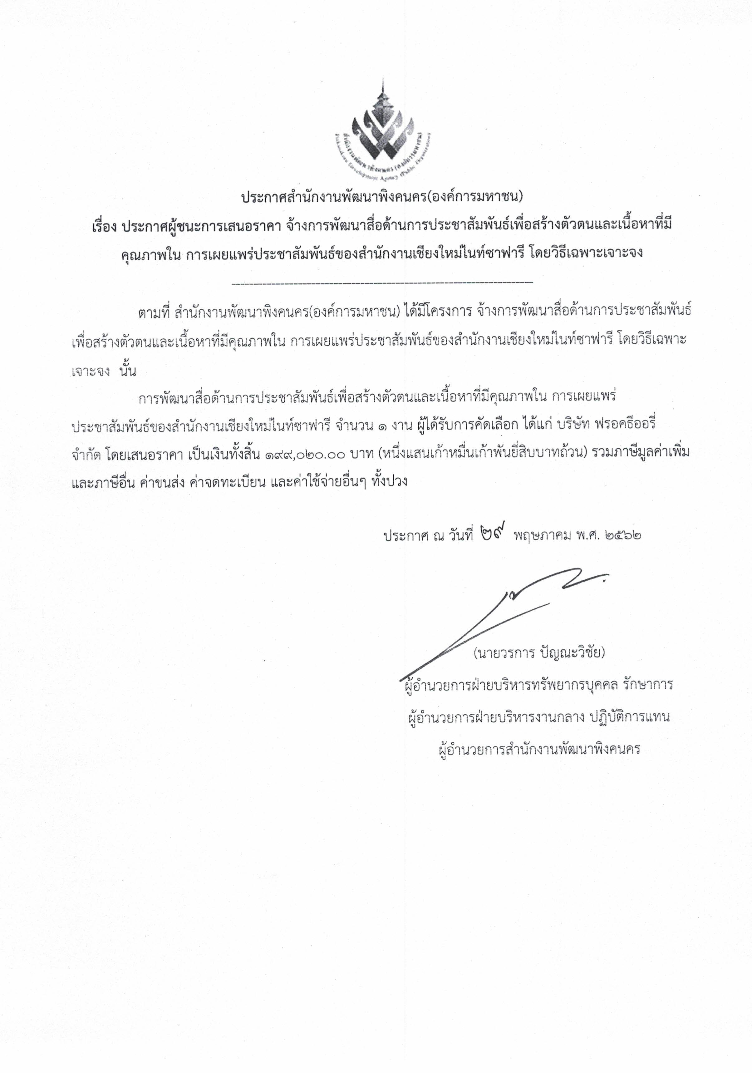 (ภาษาไทย) ประกาศผู้ชนะการเสนอราคา จ้างการพัฒนาสื่อด้านการประชาสัมพันธ์เพื่อสร้างตัวตนและเนื้อหาที่มีคุณภาพในการเผยแพร่ประชาสัมพันธ์ของสำนักงานเชียงใหม่ไนท์ซาฟารี โดยวิธีเฉพาะเจาะจง