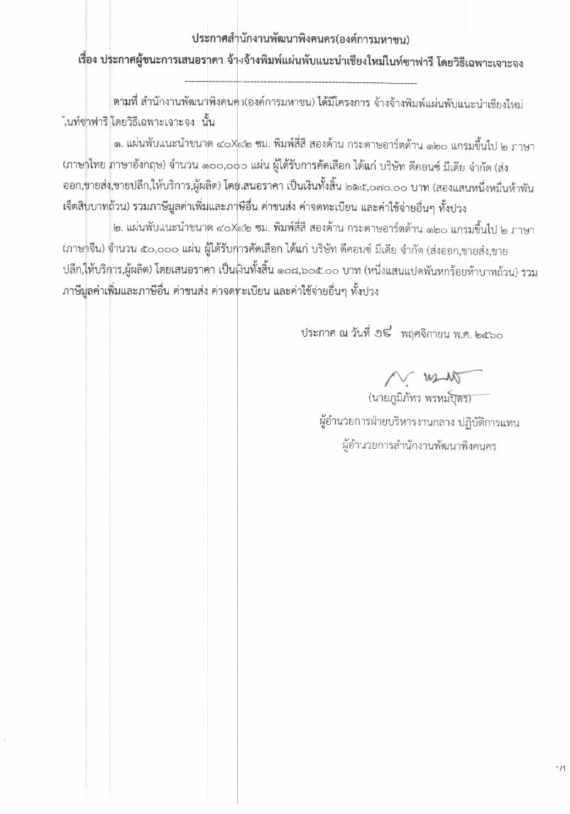 (ภาษาไทย) ประกาศผู้ชนะการเสนอราคา จ้างพิมพ์แผ่นพับแนะนำเชียงใหม่ไนท์ซาฟารี โดยวิธีเฉพาะเจาะจง