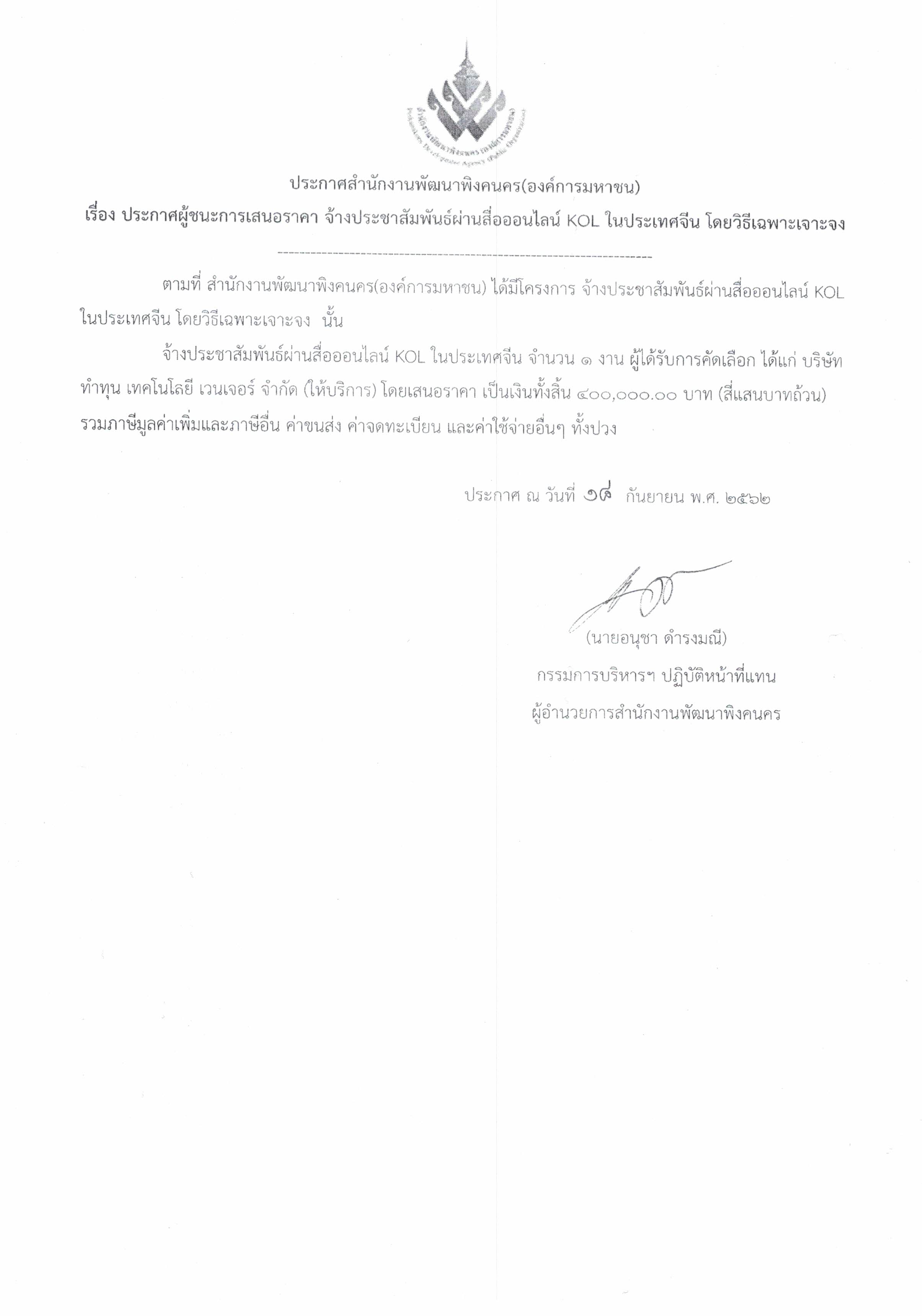 (ภาษาไทย) ประกาศผู้ชนะการเสนอราคา จ้างประชาสัมพันธ์ผ่านสื่อออนไลน์ KOL ในประเทศจีน โดยวิธีเฉพาะเจาะจง