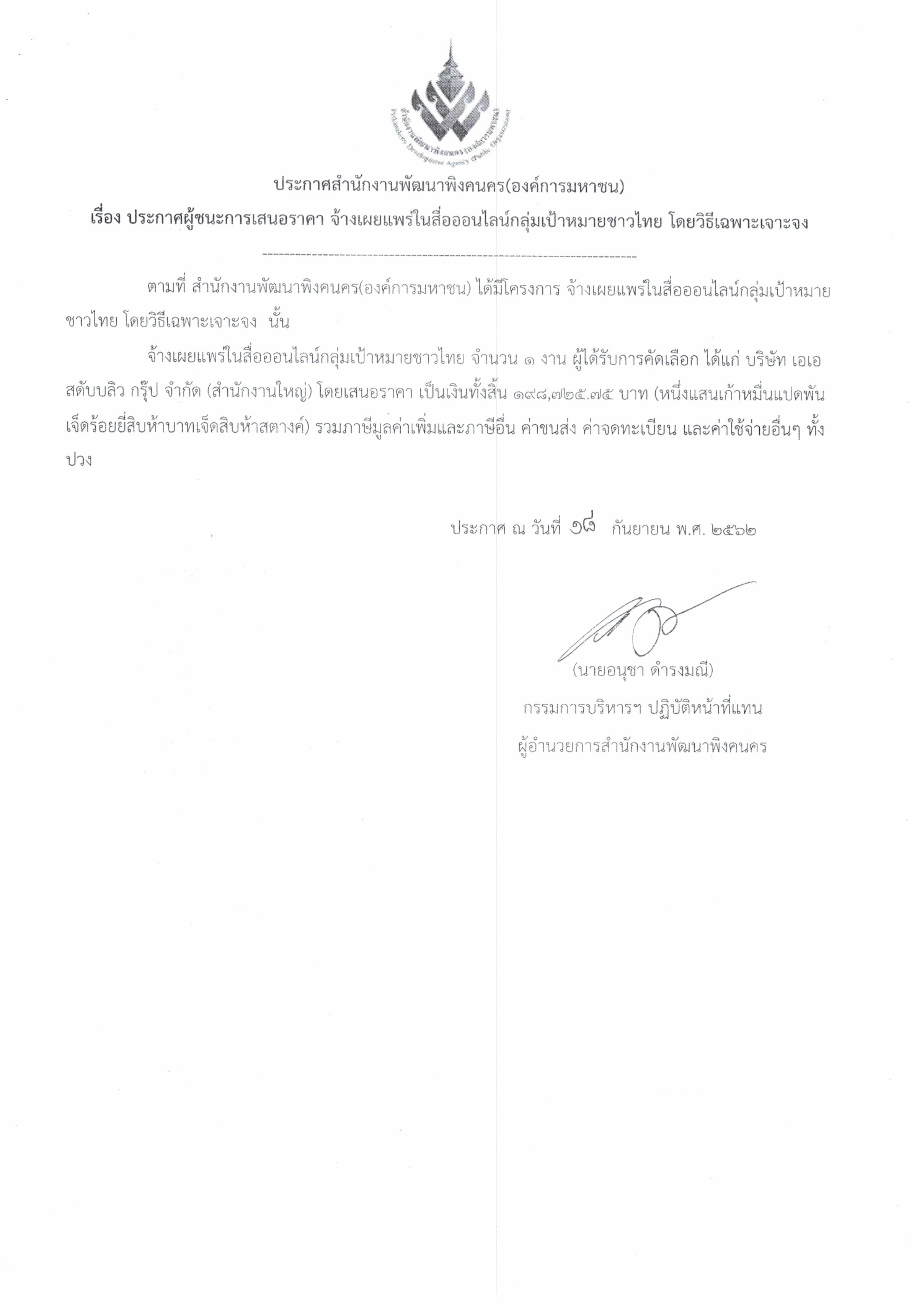 (ภาษาไทย) ประกาศผู้ชนะการเสนอราคา จ้างเผยแพร่ในสื่อออนไลน์กลุ่มเป้าหมายชาวไทย โดยวิธีเฉพาะเจาะจง