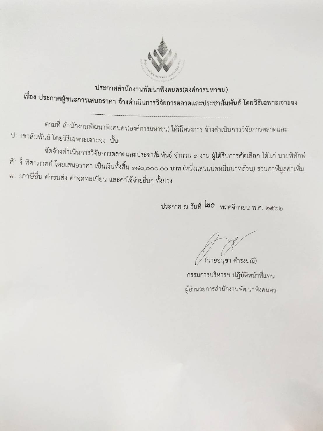 (ภาษาไทย) ประกาศผู้ชนะการเสนอราคา จ้างดำเนินการวิจัยการตลาดและประชาสัมพันธ์ โดยวิธีเฉพาะเจาะจง
