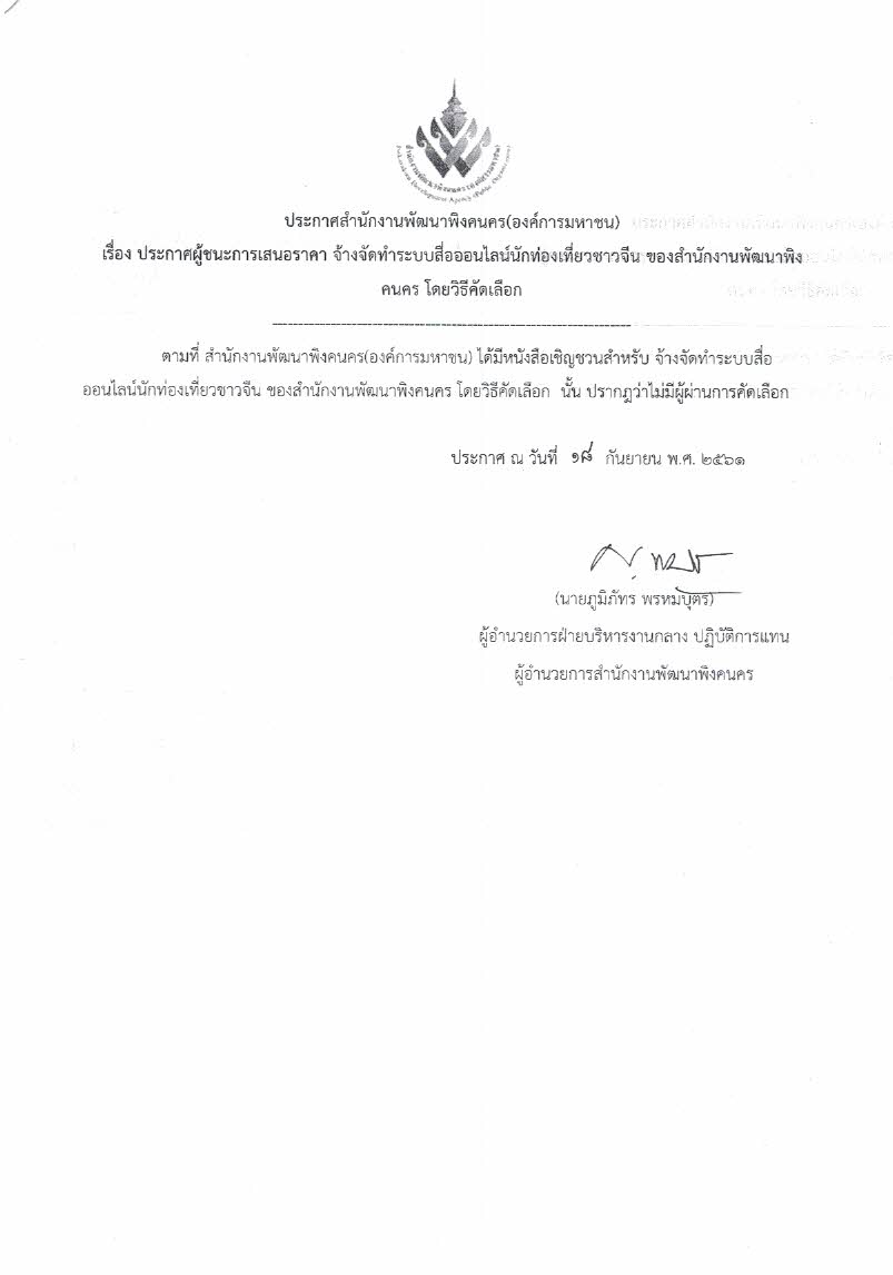 ประกาศผู้ชนะการเสนอราคา จ้างจัดทำระบบสื่อออนไลน์นักท่องเที่ยวจีน ของสำนักงานพัฒนาพิงคนคร โดยวิธีคัดเลือก