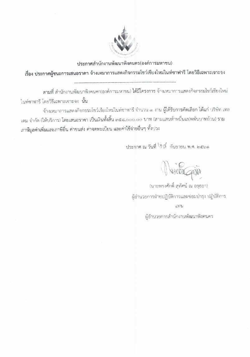 ประกาศผู้ชนะการเสนอราคา จ้างเหมาการแสดงกิจกรรมโชว์เชียงใหม่ไนท์ซาฟารี โดยวิธีเฉพาะเจาะจง