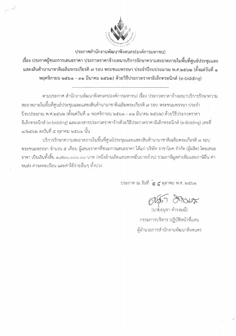 ประกาศผู้ชนะการเสนอราคา ประกวดราคาจ้างเหมาบริการรักษาความสะอาดภายในพื้นที่ศูนย์ประชุมและแสดงสินค้านานาชาติเฉลิมพระเกียรติ 7 รอบพระชนมพรรษา ประจำปีงบประมาณ พ.ศ.2562 (ตั้งแต่วันที่ 1 พฤศจิกายน 2561 – 31 มีนาคม 2562) ด้วยวิธีประกวดราคาอิเล็กทรอนิกส์ (e-bidding)