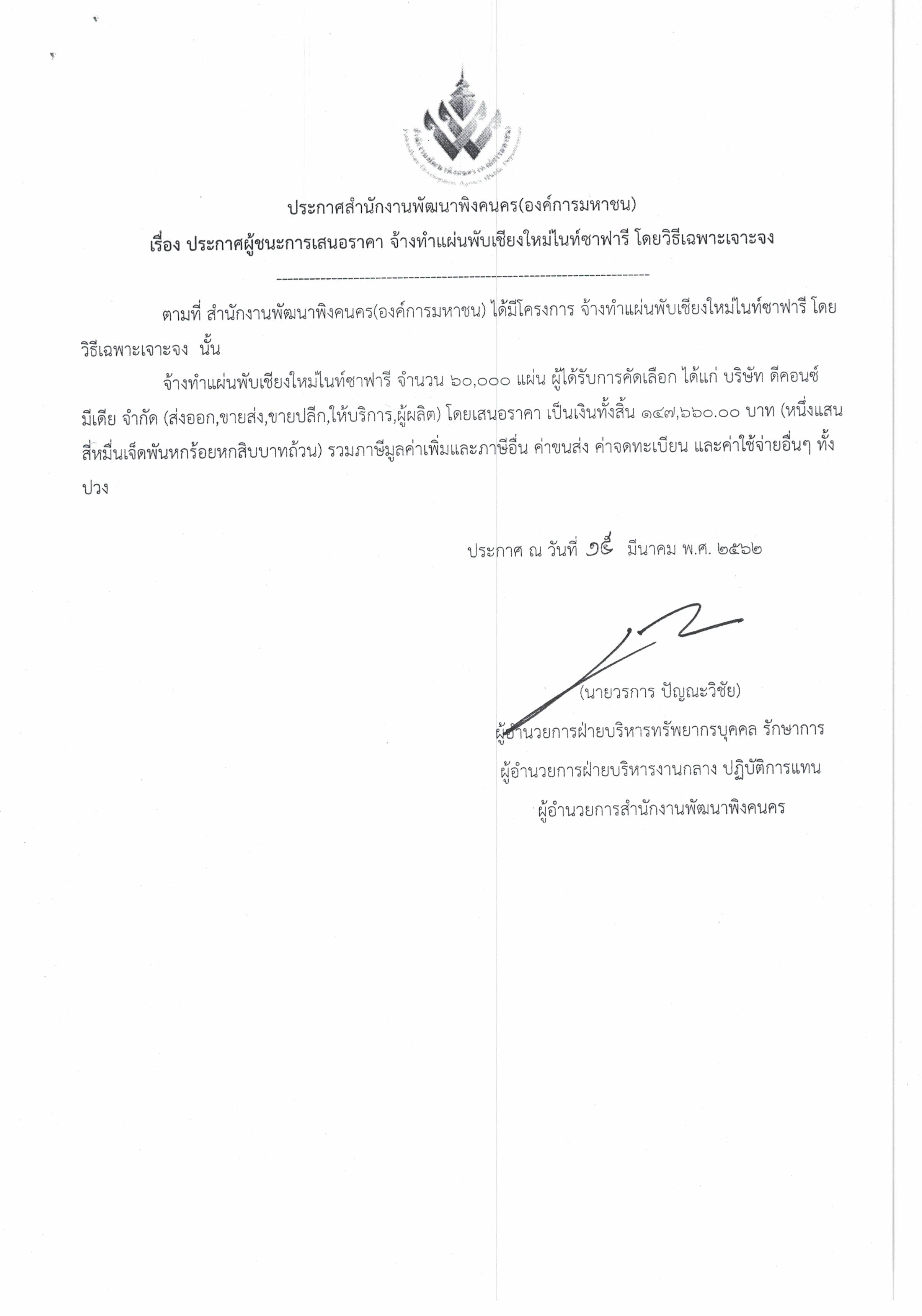 (ภาษาไทย) ประกาศผู้ชนะการเสนอราคา จ้างทำแผ่นพับเชียงใหม่ไนท์ซาฟารี โดยวิธีเฉพาะเจาะจง