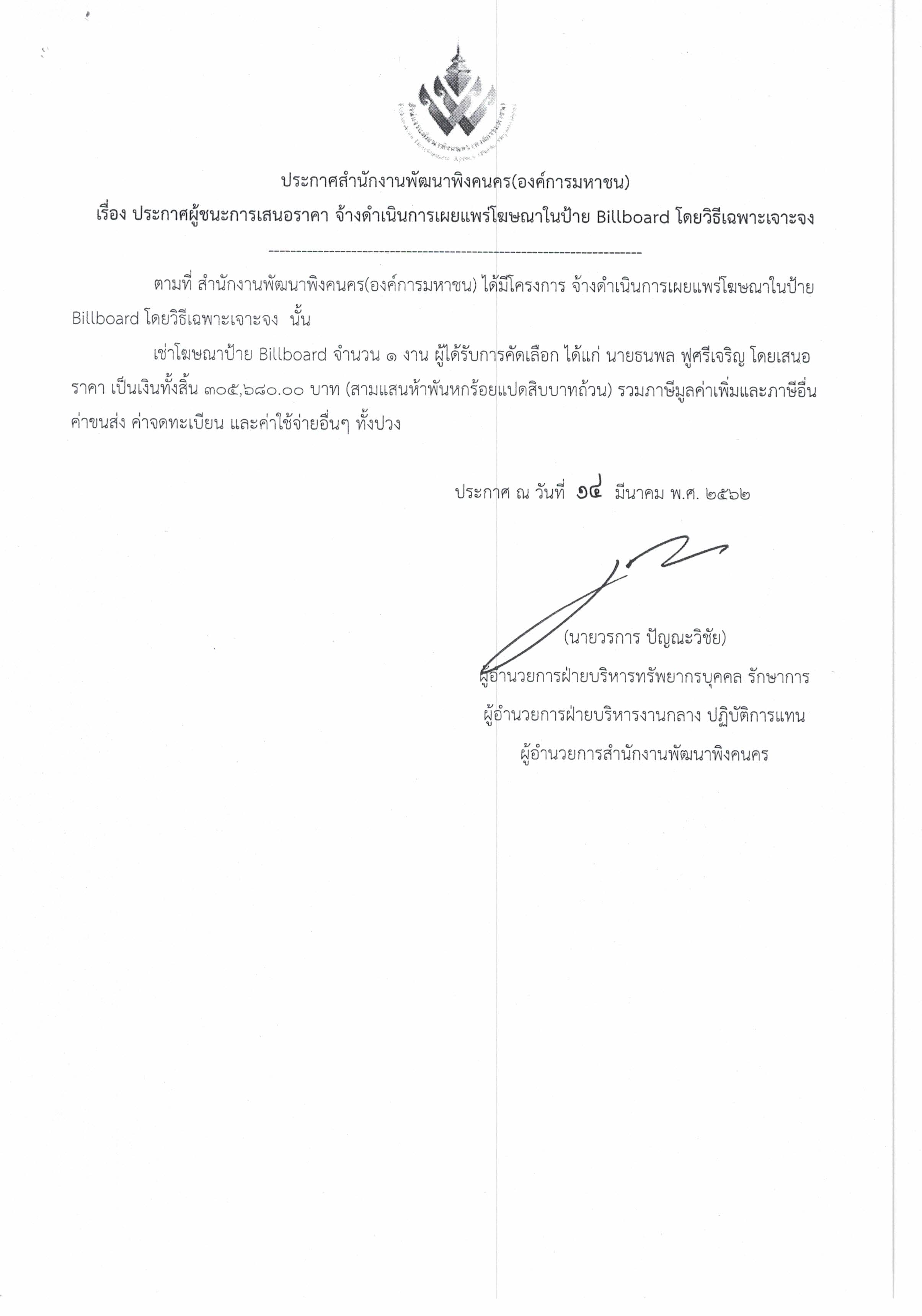 (ภาษาไทย) ประกาศผู้ชนะการเสนอราคา จ้างดำเนินการเผยแพร่โฆษณาในป้าย Billboard โดยวิธีเฉพาะเจาะจง
