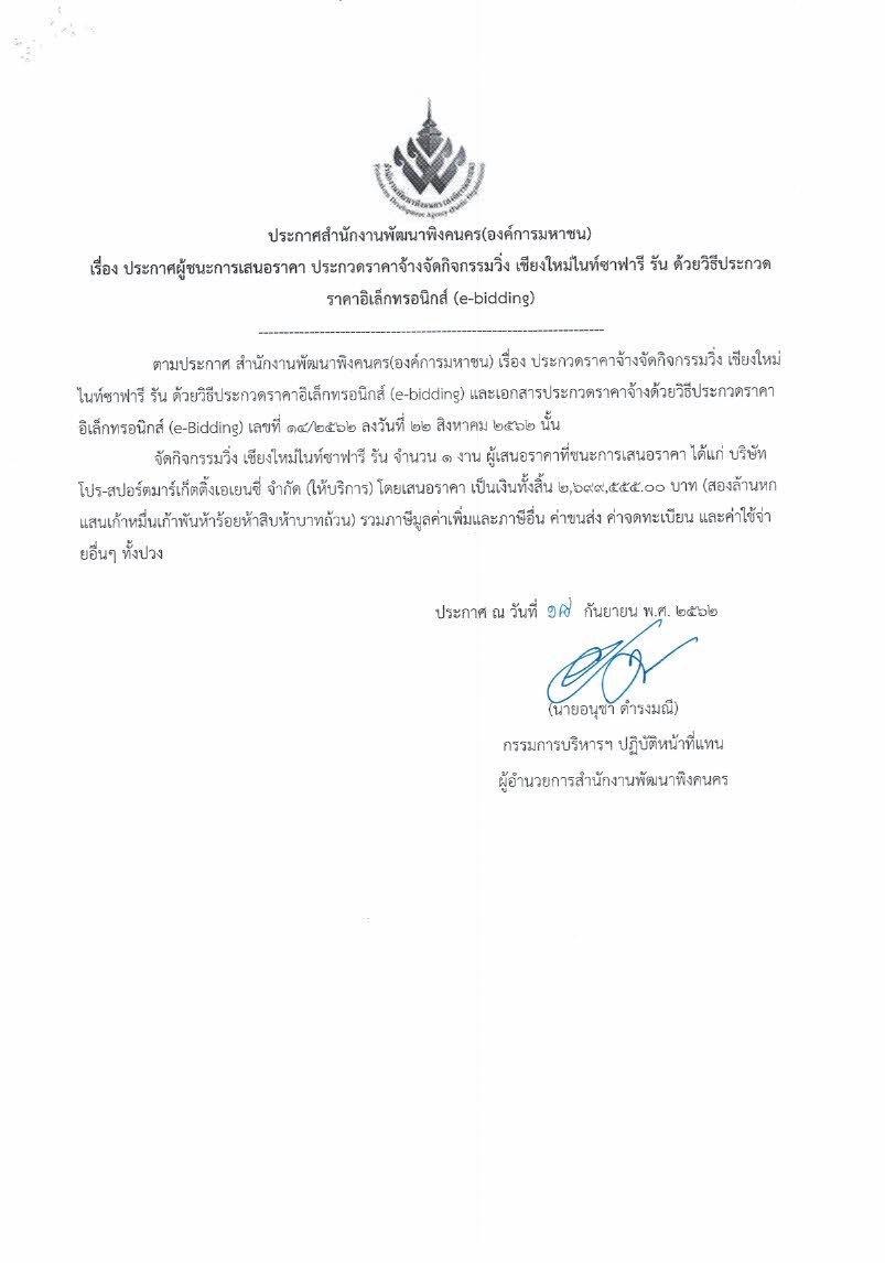 (ภาษาไทย) ประกาศผู้ชนะการเสนะราคา ประกวดราคาจ้างจัดกิจกรรมวิ่ง เชียงใหม่ไนท์ซาฟารี รัน ด้วยวิธีประกวดราคาอิเล็กทรอนิกส์ (e-bidding)