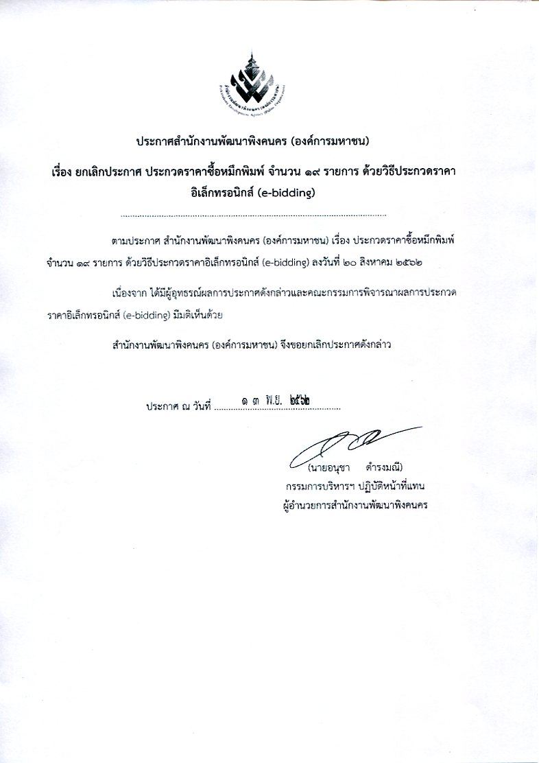 (ภาษาไทย) ยกเลิกประกาศ ประกวดราคาซื้อหมึกพิมพ์ จำนวน 19 รายการ ด้วยวิธีประกวดราคาอิเล็กทรอนิกส์ (e-bidding)