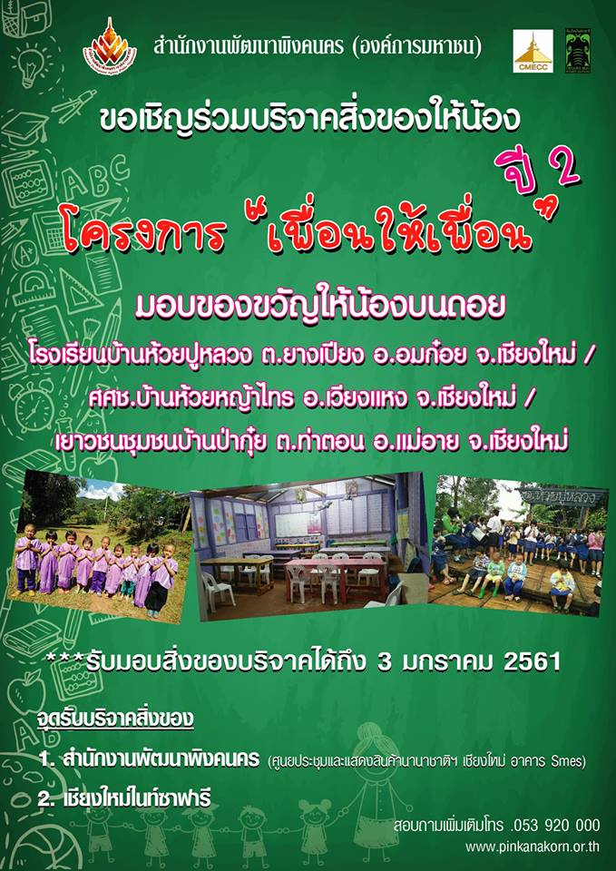👦🏼👧🏻.. สำนักงานพัฒนาพิงคนคร (องค์การมหาชน) ขอเชิญชวนน้องๆ เยาวชน ร่วมโครงการ “เพื่อนให้เพื่อน ปี 2” เพื่อแบ่งปันความสุขให้แก่เพื่อนผู้ด้อยโอกาสในพื้นที่ห่างไกล และเพื่อปลูกฝังจิตสำนึกในการแบ่งปันการเป็นผู้ให้แก่เยาวชน เนื่องในวันเด็กแห่งชาติ โดยการร่วมแบ่งปันของเล่น หนังสือนิทาน และของใช้อื่นๆ ในสภาพดี เพื่อแบ่งปันความสุขให้แก่เพื่อนผู้ด้อยโอกาสในพื้นที่ศูนย์การเรียนรู้ชุมชน บ้านห้วยหญ้าไทร อ.เวียงแหง จ.เชียงใหม่, เยาวชนบ้านป่ากุ๋ย ต.ท่าตอน อ.แม่อาย จ.เชียงใหม่ และโรงเรียนบ้านห้วยปูหลวง อ.อมก๋อย จ.เชียงใหม่ ในวันที่ 5 – 6 มกราคม 2561