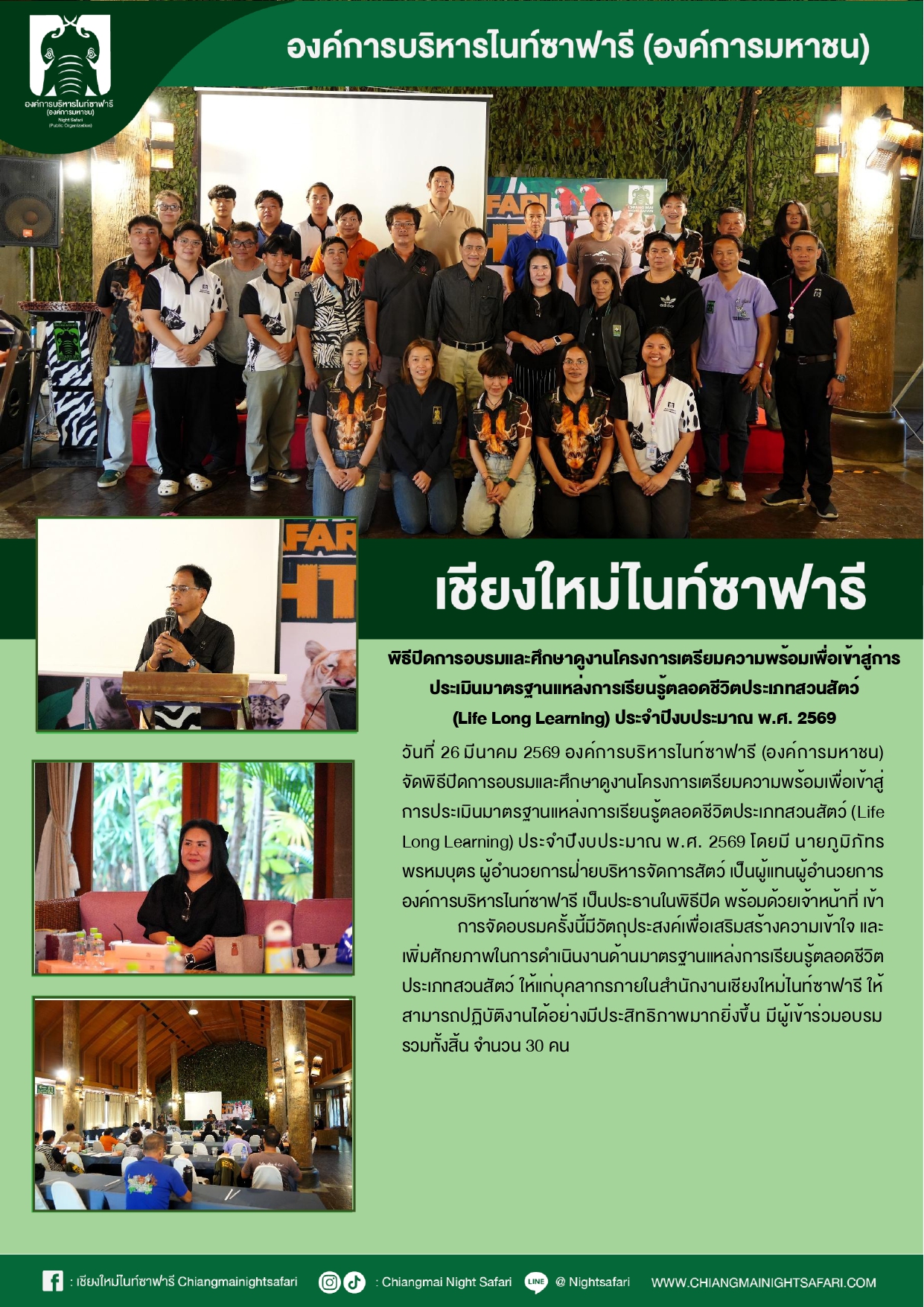 เชียงใหม่ไนท์ซาฟารี พิธีการอบรมและศึกษาดูงานโครงการเตรียมความพร้อมเพื่อเข้าสู่การประเมินมาตรฐานแหล่งการเรียนรู้ตลอดชีวิตประเภทสัตว์ (Life Long Leaning) ประจำปีงบประมาณ พ.ศ.2569