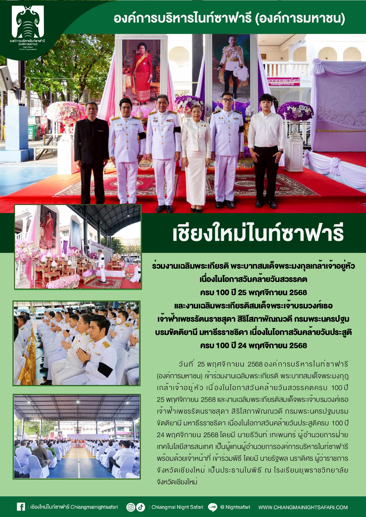 เชียงใหม่ไนท์ซาฟารี ร่วมงานเฉลิมพระเกียรติ พระบาทสมเด็จพระมงกุลเกล้าเจ้าอยู่หัว เนื่องในโอกาศวันคล้ายวันสวรรคตครบ 100 ปี 25 พฤศจิกายน 2568 และงานเฉลิมพระเกียรติสมเด็จพระเจ้าบรมวงศ์เธอเจ้าฟ้าเพชรรัตนราชสุดา สิริโสภาพัณณวดี กรมพระนครปฐมบรมขัตติยานี มหาธีรราชธิดา เนื่องในโอกาศวันคล้ายวันประสูติครบ 100 ปี 24 พฤศจิกายน 2568