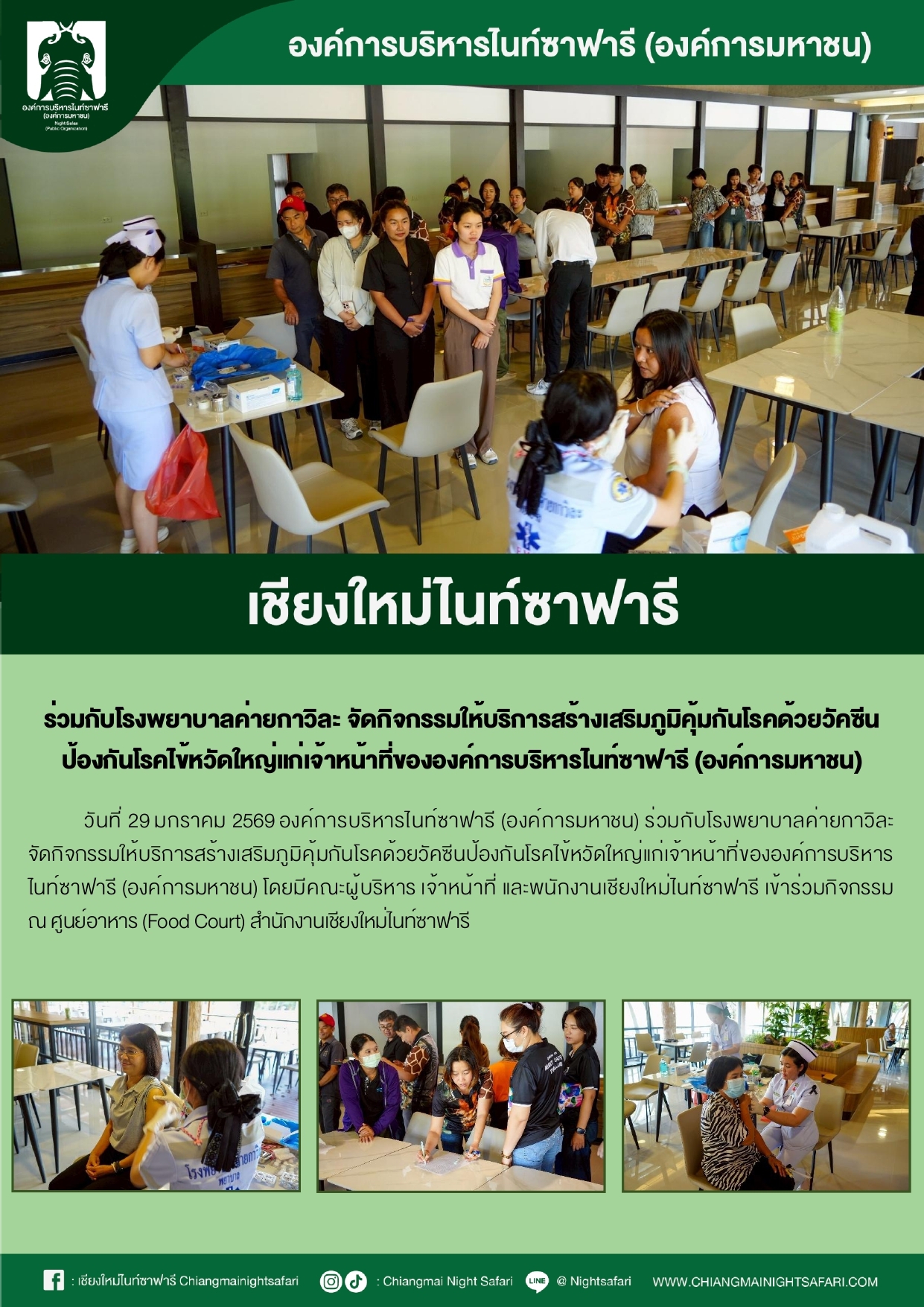 เชียงใหม่ไนท์ซาฟารี ร่วมกับโรงพยาบาลค่ายกาวิละ จัดกิจกรรมให้บริการสร้างเสริมภูมิคุ้มกันโรคด้วยวัคซีน ป้องกันโรคไข้หวัดใหญ่แก่เจ้าหน้าที่ขององค์การบริหารไนท์ซาฟารี (องค์การมหาชน)