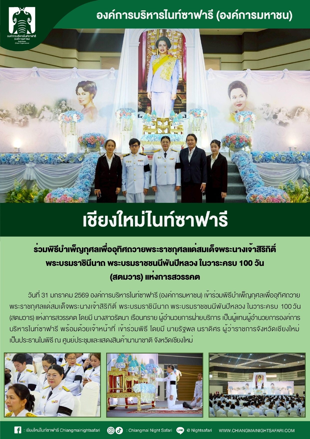 เชียงใหม่ไนท์ซาฟารี ร่วมพิธีบำเพ็ญกุศลเพื่ออุทิศถวายพระราชกุศลแด่สมเด็จพระนางเจ้าสิริกิติ์ พระบรมราชินีนาถ พระบรมราชชนนีพันปีหลวง ในวาระครบ 100 วัน (สตมวาร) แห่งการสวรรคต