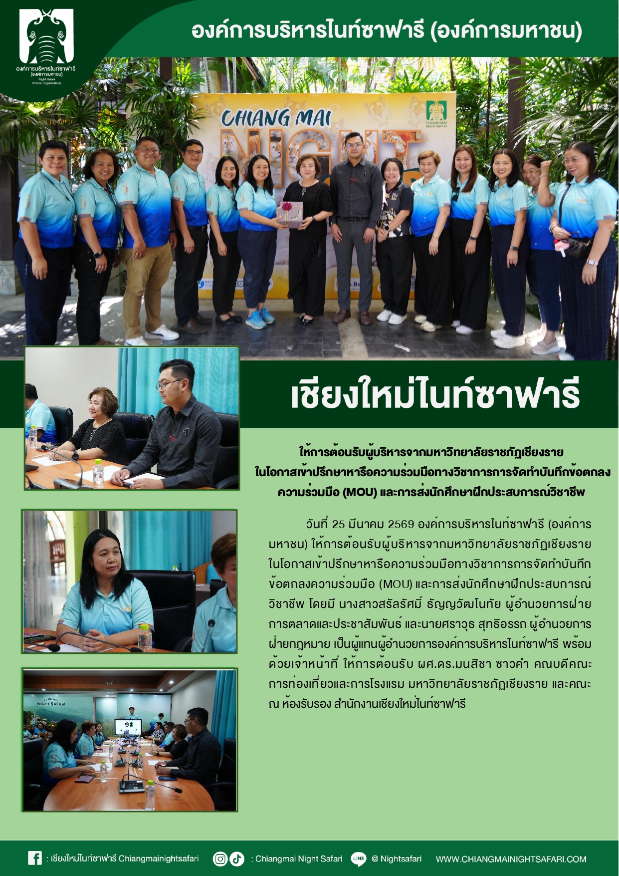 เชียงใหม่ไนท์ซาฟารี ให้การต้อนรับผู้บริหารจากมหาวิทยาลัยราชภัฏเชียงรายในโอกาศเข้าปรึกษาหารือความร่วมมือวิชาการจัดทำบันทึกข้อตกลงความร่วมมือ (MOU) และการส่งนักศึกษาฝึกประสบการ์ณวิชาชีพ