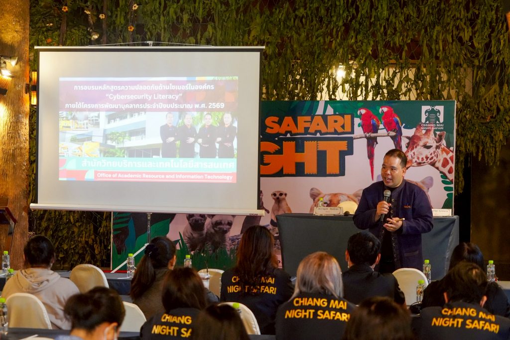วันที่ 30 มกราคม 2569 องค์การบริหารไนท์ซาฟารี (องค์การมหาชน) จัดการอบรมหลักสูตรความปลอดภัยด้านไซเบอร์ในองค์กร “Cybersecurity Literacy” ภายใต้โครงการพัฒนาบุคลากร ประจำปีงบประมาณ พ.ศ. 2569 โดยมี นายศราวุธ สุทธิอรรถ ผู้อำนวยการฝ่ายกฎหมาย เป็นผู้แทนผู้อำนวยการองค์การบริหารไนท์ซาฟารี ทำหน้าที่ประธานในพิธีเปิด พร้อมด้วยเจ้าหน้าที่เข้าร่วมการอบรม โดยมี ผู้ช่วยศาสตราจารย์ภาณุเดช ทิพย์อักษร รองผู้อำนวยการสำนักวิทยบริการและเทคโนโลยีสารสนเทศ, คุณประเสริฐ เทพภาพ นักวิชาการคอมพิวเตอร์ชำนาญการ และ คุณออมทรัพย์ อินกองงาม นักวิชาการคอมพิวเตอร์ชำนาญการ เป็นวิทยากรบรรยายให้ความรู้ ณ ห้องประชุมเฮือนวารีกุญชร สำนักงานเชียงใหม่ไนท์ซาฟารี