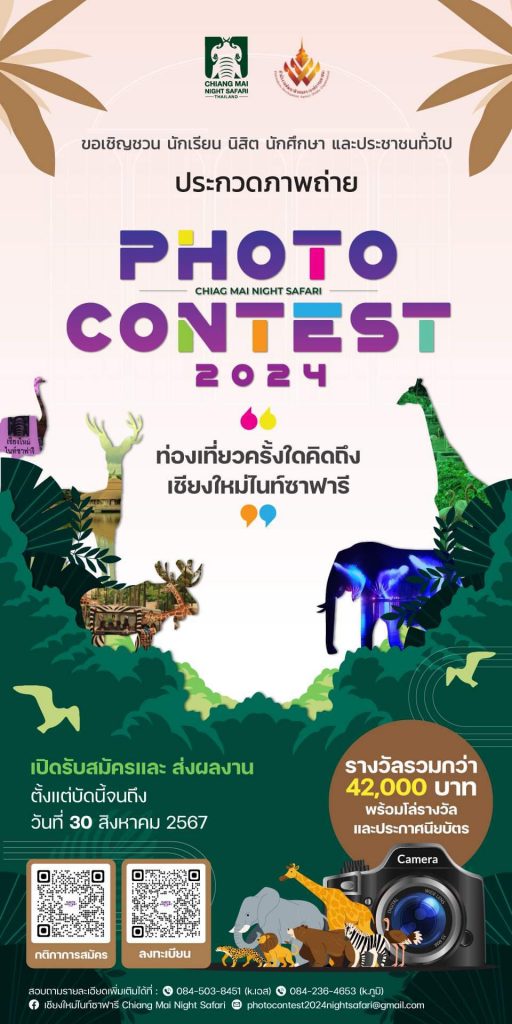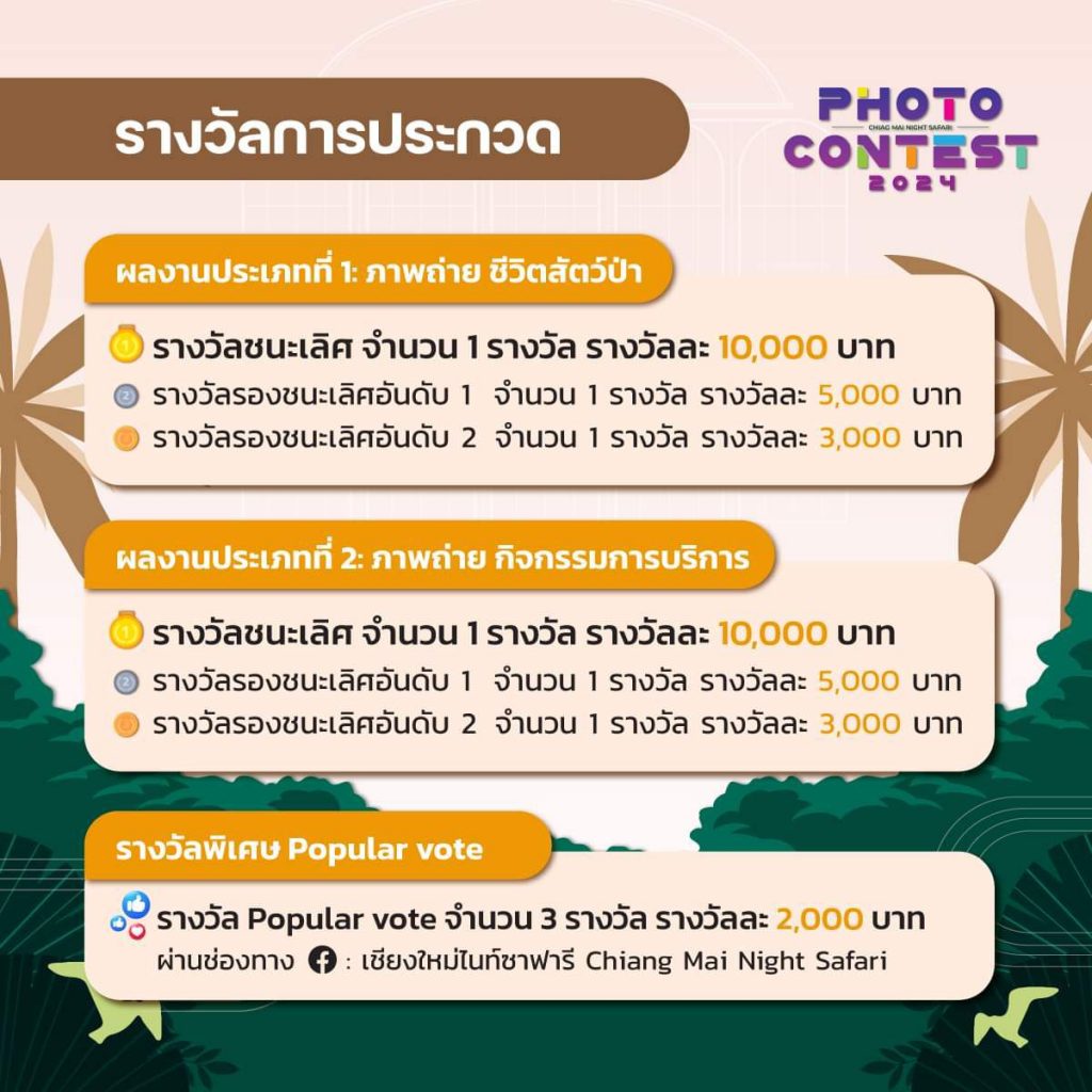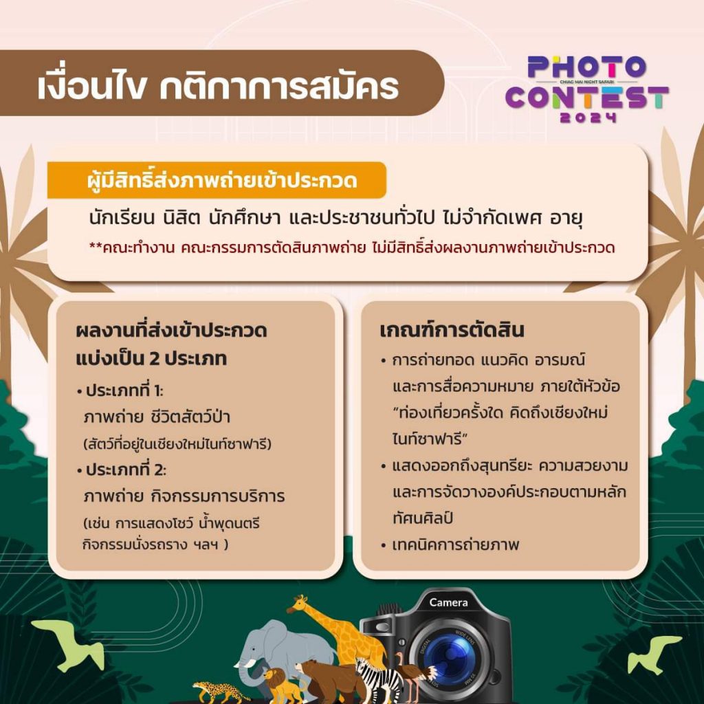 ทั้งนี้ ขอเชิญชวนผู้ที่สนใจเข้าร่วมกิจกรรมการประกวดถ่ายภาพเชียงใหม่ไนท์ซาฟารี “ท่องเที่ยวครั้งใดคิดถึงเชียงใหม่ไนท์ซาฟารี” ชิงเงินรางวัลมูลค่ารวมกว่า 42,000 บาท พร้อมโล่รางวัล และใบประกาศนียบัตร สามารถสมัครและส่งผลงานได้ ตั้งแต่บัดนี้จนถึงวันที่ 30 สิงหาคม 2567 และปิดการส่งผลงานประกวด ในวันที่ 30 สิงหาคม 2567 เวลา 23.59 น. โดยสามารถศึกษารายละเอียดเพิ่มเติมได้ที่ลิงค์ https://drive.google.com/drive/folders/1blQuCmdAATp7q2PYxWEe7u-uj46NbW4l และสมัครพร้อมกรอกข้อมูลสำคัญให้ครบถ้วน ได้ที่ลิงค์ https://forms.gle/uswzpUQj2RmQJiwAA