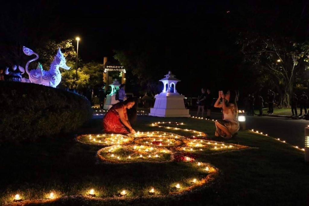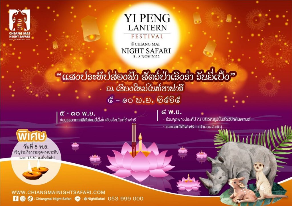 และในวันที่ 8 พฤศจิกายน 2565 เวลา 18.30 น. เชิญชวนนักท่องเที่ยวชมการแสดงพิเศษชุดสืบสานศิลปวัฒนธรรมล้านนา ที่บอกเล่าเรื่องราวความสำคัญของประเพณียี่เป็ง และร่วม “จุดผางประทีป เพื่อความเป็นสิริมงคลและสักการะสิ่งศักดิ์สิทธิ์โดยรอบเชียงใหม่ไนท์ซาฟารี พร้อมชมพลุโอ่ง พลุไฟเย็น ถ่ายภาพกับซุ้มโคมยี่เป็ง และร่วมชมปรากฏการณ์จันทรุปราคา ณ บริเวณรูปปั้นสัตว์ป่าหิมพานต์ นอกจากนี้ นักท่องเที่ยวสามารถร่วมเก็บภาพความประทับใจในจุดต่างๆ ที่ตกแต่งและประดับด้วยสีสันของประเพณียี่เป็ง และการนั่งรถชมสัตว์ของเชียงใหม่ไนท์ซาฟารี เพลิดเพลินกับกิจกรรมต่างๆ ได้ตั้งแต่เวลา 11.00 – 21.00 น.