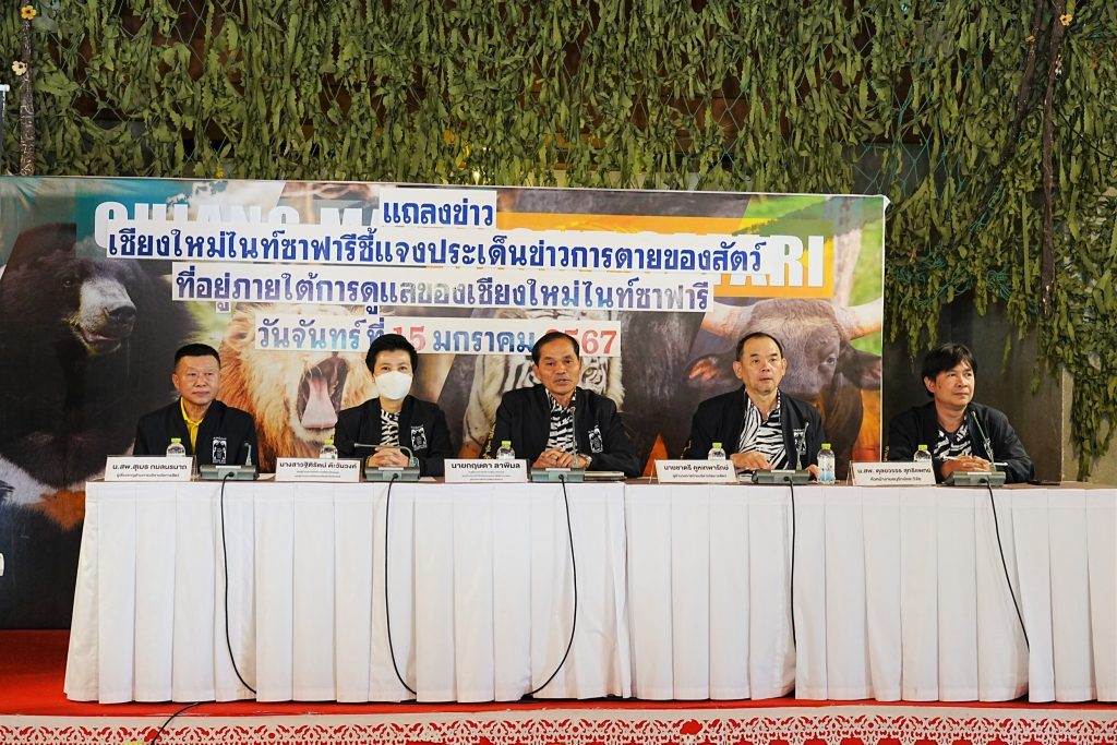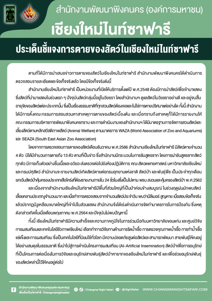 วันที่ 15 มกราคม 2567 สำนักงานเชียงใหม่ในท์ซาฟารี โดยสำนักงานพัฒนาพิงคนคร (องค์การมหาชน) จัดแถลงข่าว ชี้แจงประเด็นข่าวการตายของสัตว์ที่อยู่ภายใต้การดูแลของเชียงใหม่ไนท์ซาฟารี เพื่อชี้แจงข้อเท็จจริงและให้ข้อมูลเกี่ยวกับกรณีดังกล่าว