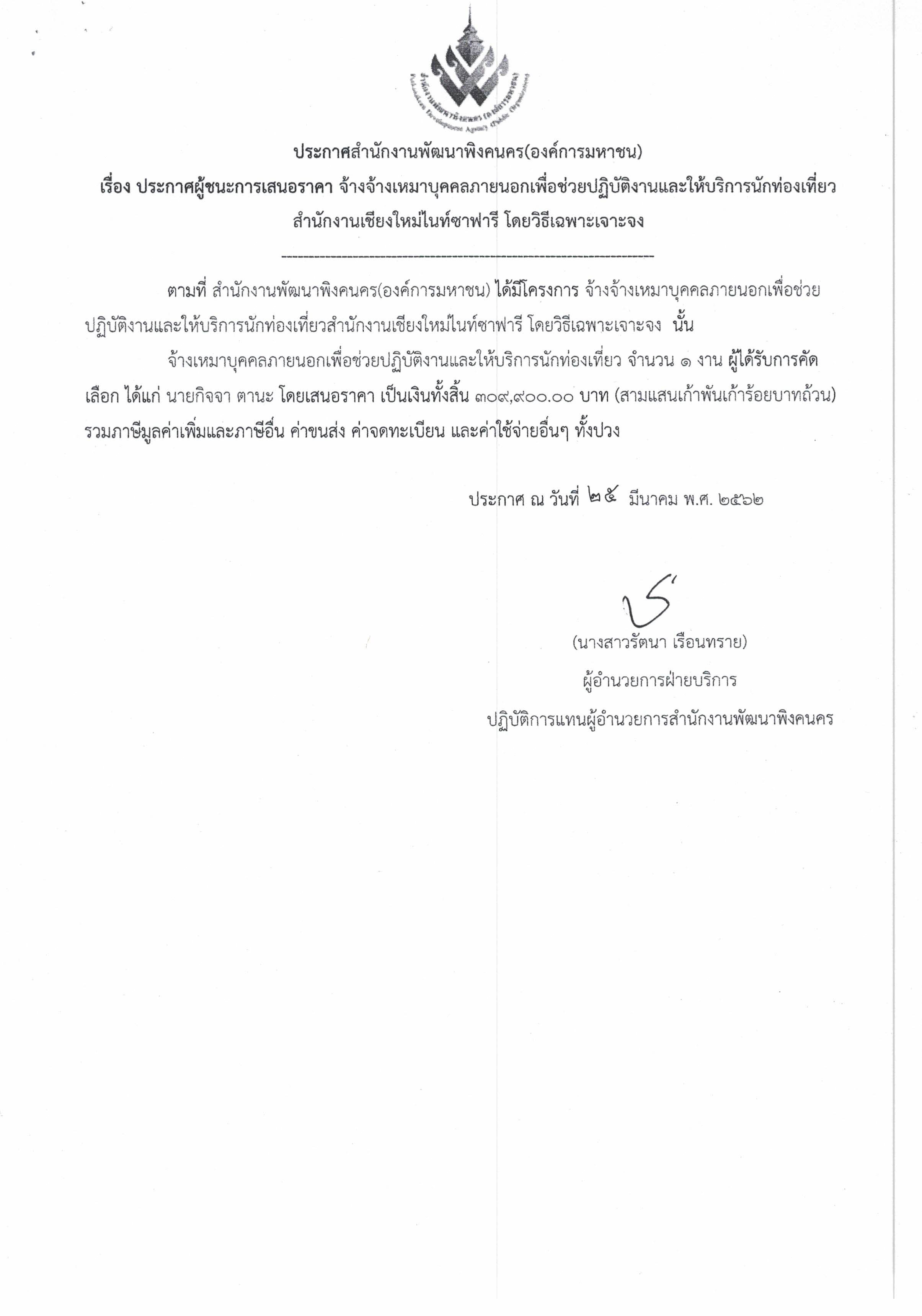 ประกาศผู้ชนะการเสนอราคา จ้างจ้างเหมาบุคคลภายนอกเพื่อช่วยปฏิบัติงานและให้บริการนักท่องเที่ยว สำนักงานเชียงใหม่ไนท์ซาฟารี โดยวิธีเฉพาะเจาะจง