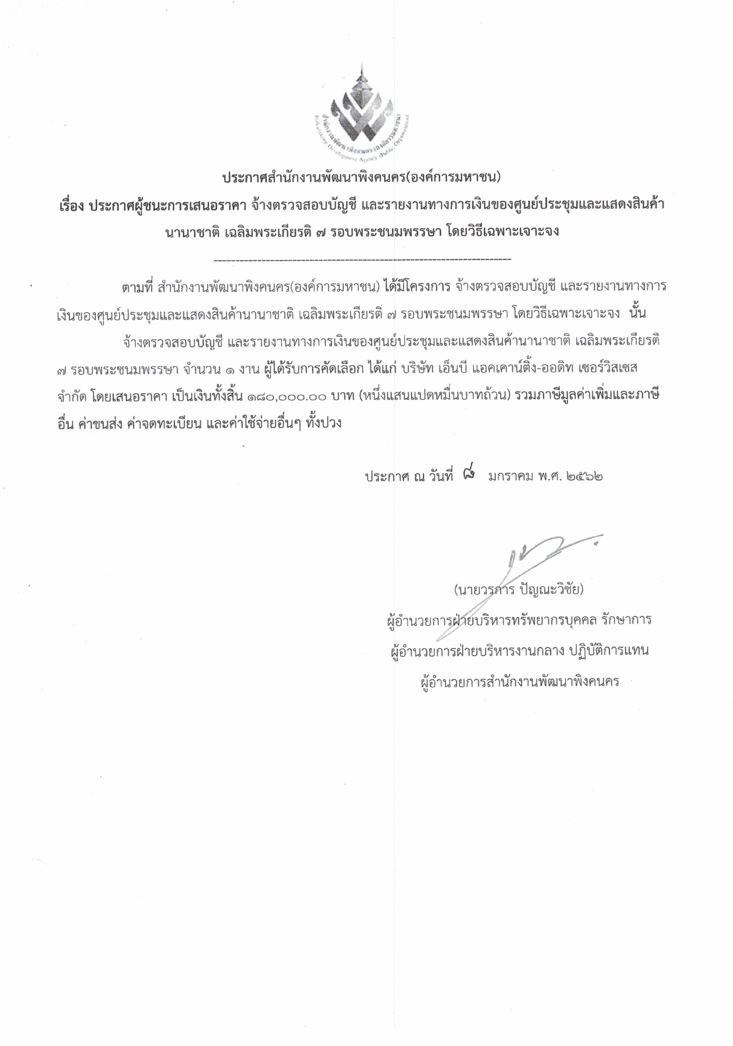 ประกาศผู้ชนะการเสนอราคา จ้างตรวจสอบบัญชี และรายงานทางการเงินของศูนย์ประชุมและแสดงสินค้านานาชาติ เฉลิมพระเกียรติ 7 รอบพระชนมพรรษา โดยวิธีเฉพาะเจาะจง