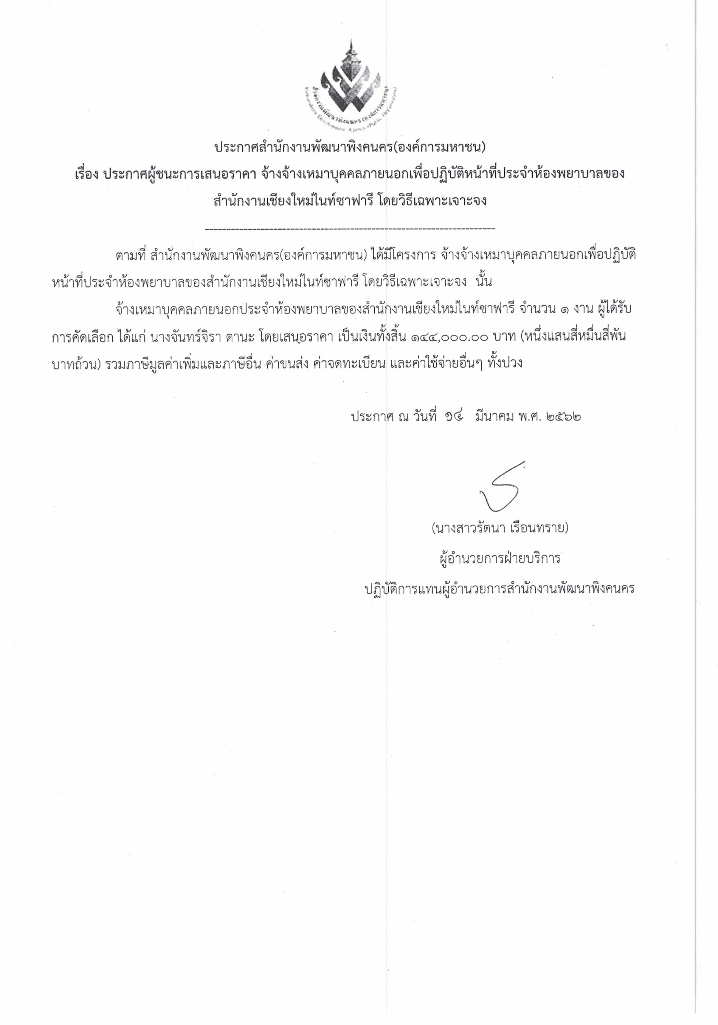 ประกาศผู้ชนะการเสนอราคา จ้างจ้างเหมาบุคคลภายนอกเพื่อปฎิบัติหน้าที่ประจำห้องพยาบาลของสำนักงานเชียงใหม่ไนท์ซาฟารี โดยวิธีเฉพาะเจาะจง