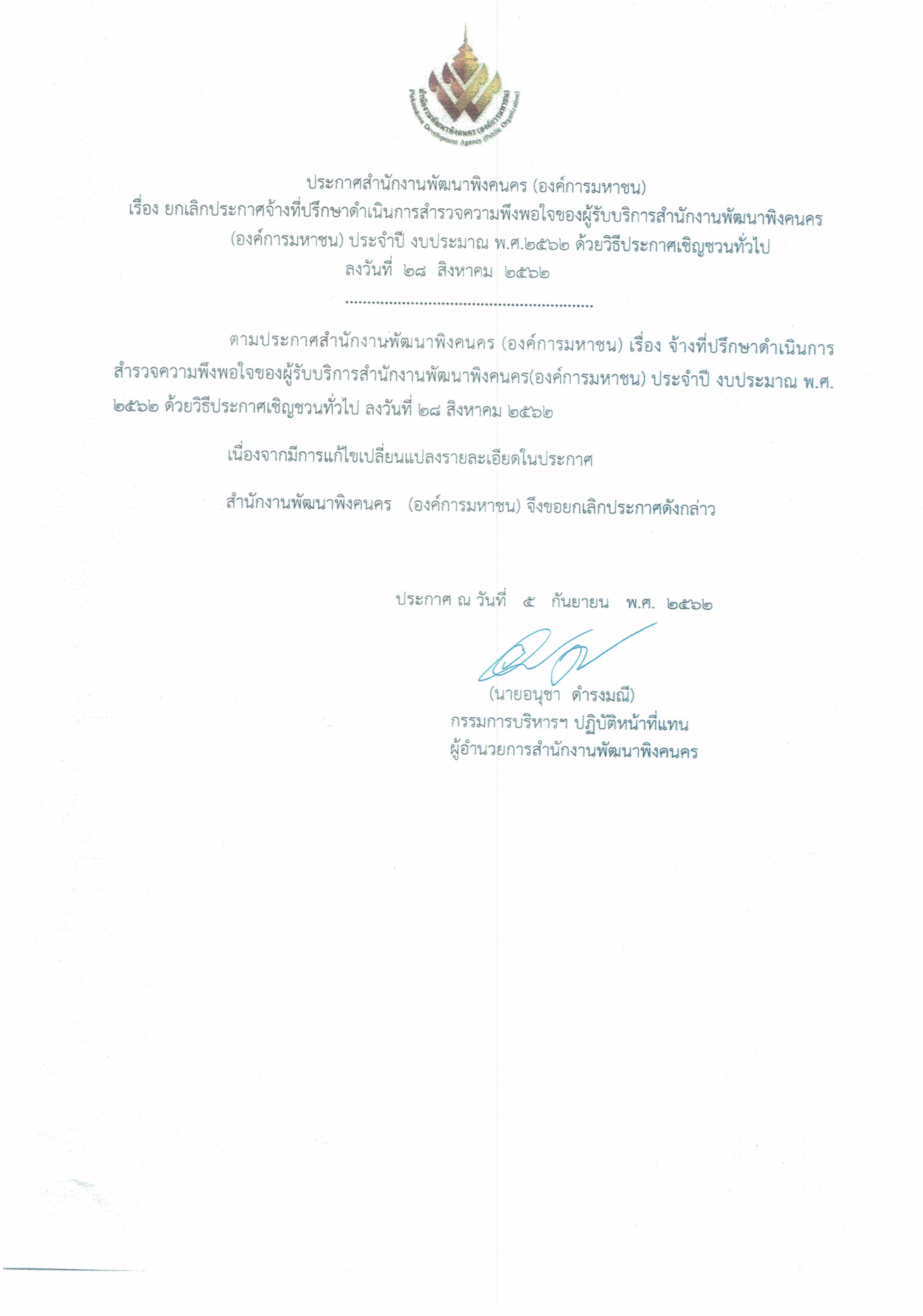 ยกเลิกประกาศ จ้างที่ปรึกษาดำเนินการสำรวจความพึงพอใจของผู้รับบริการสำนักงานพัฒนาพิงคนคร (องค์การมหาชน) ประจำปีงบประมาณ พ.ศ.2562 ด้วยวิธีประกาศเชิญชวนทั่วไป